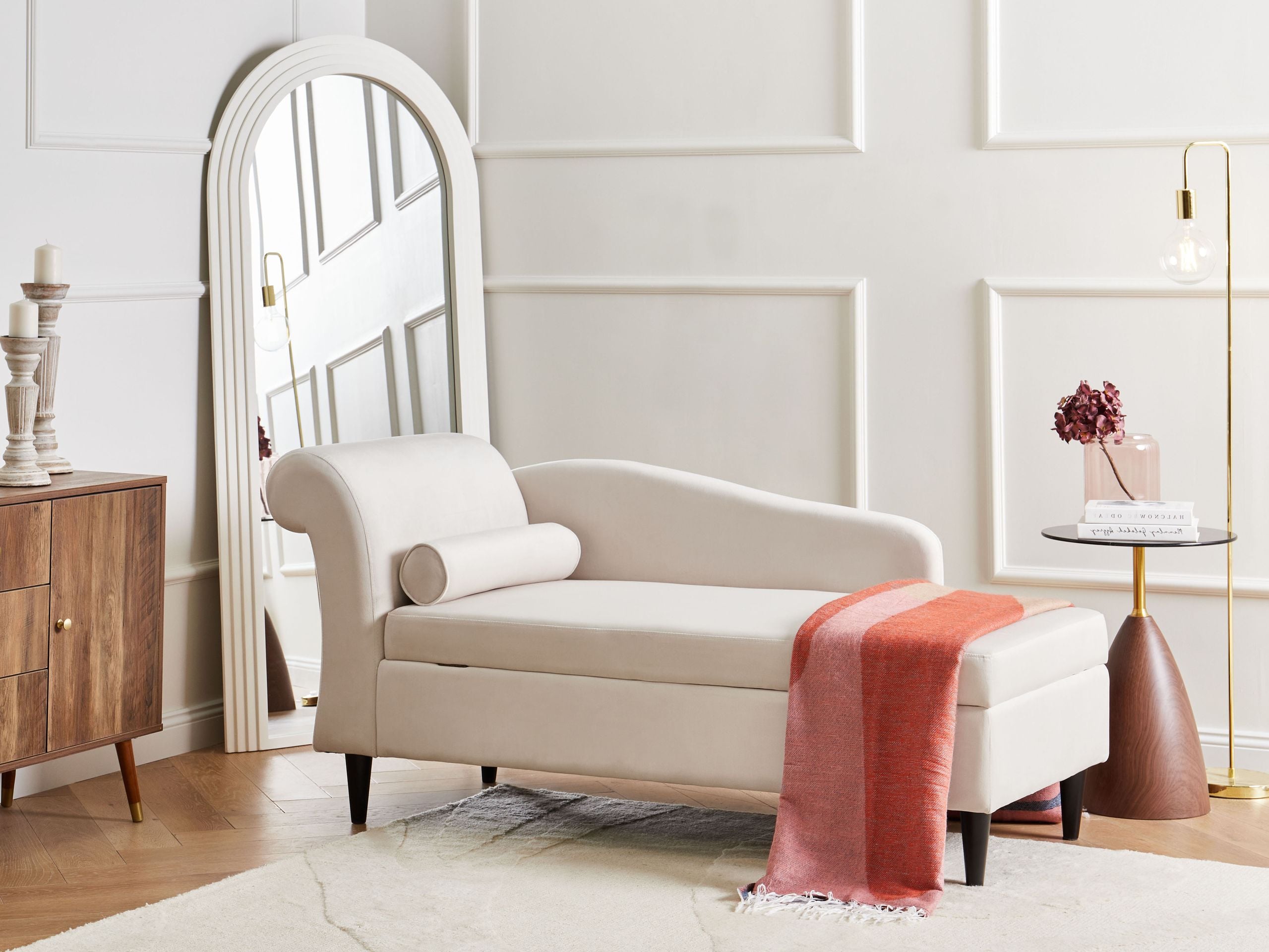 Tyylikäs samettidivaani säilytystilalla. Tästä klassista tyyliä huokuvasta, kauniisti muotoillusta divaanista tulee välittömästi minkä tahansa huoneen keskipiste. Elegantti muoto, tukevat eukalyptuspuujalat ja pehmeä täyte tekevät siitä täydellisen paikan päiväunille tai rentoon loikoiluun. Istuimen alla on kätevä säilytystila, joka tarjoaa runsaasti tilaa olohuoneen tarvikkeille, kuten koristetyynyille tai torkkupeitoille, ja pitää ne nopeasti saatavilla. Lisämukavuutta tuo yhteensopiva putkityyny, jota voidaan käyttää ylimääräisenä tukena tai tyylikkäänä aksenttina.