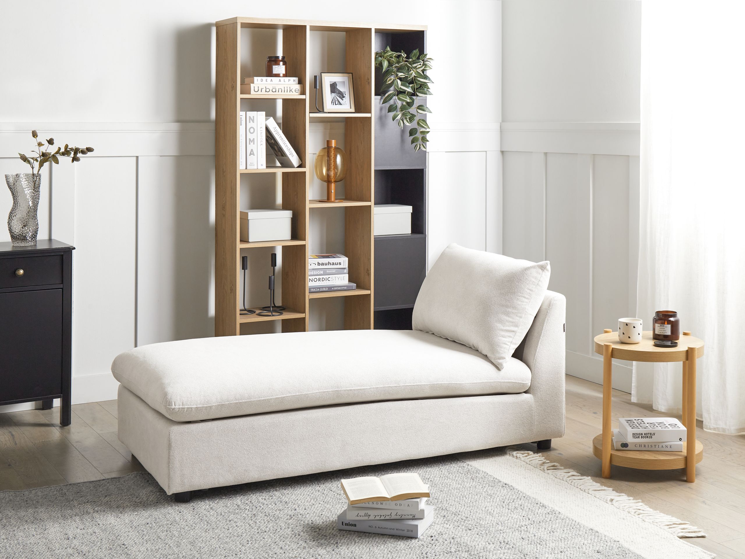 Moderni mukava makuutuoli. Kohota olohuonettasi nykyaikaisella eleganssilla tämän tyylikkään divaanin avulla. Pehmeällä ja kestävällä polyesterikankaalla verhoiltu makuutuoli tarjoaa loistavan paikan rentoutumiseen pitkän päivän jälkeen. Vettä hylkivä kangas varmistaa, että roiskeet pysyvät pinnalla, mikä helpottaa niiden puhdistusta. Lisäksi divaanissa on selkätyyny, jossa on irrotettava päällinen. Tukeva puurunko tarjoaa pitkäikäistä vakautta koko rakenteelle. Monipuolisen ja neutraalin sävynsä ansiosta se ei ainoastaan lisää hienostuneisuutta, vaan sopii myös useisiin sisustustyyleihin.
