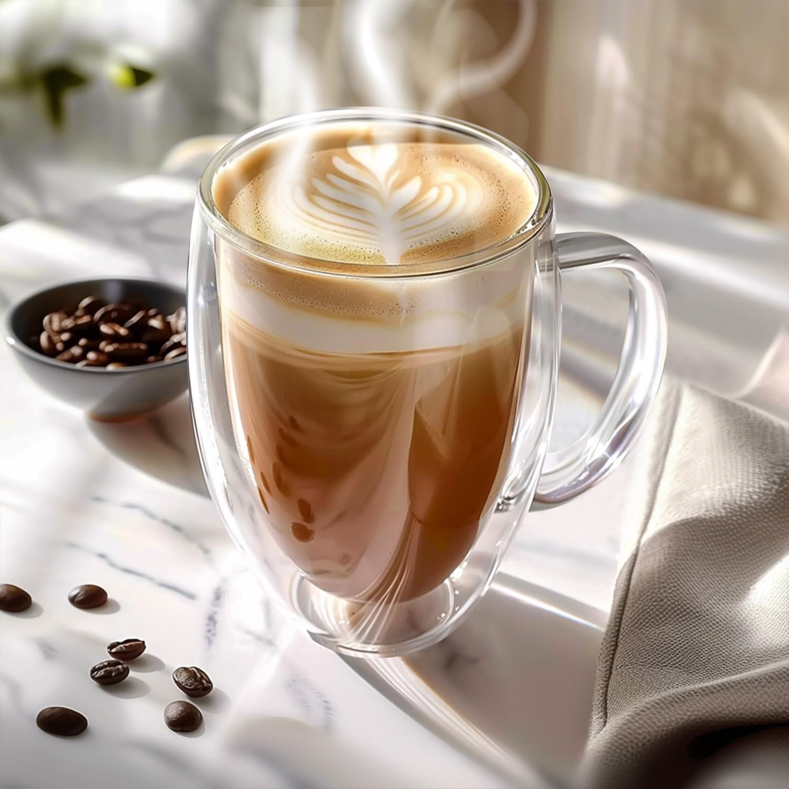 Nauti kuumat tai kylmät juomat tyylillä tässä 2 kpl kaksiseinäisiä 350 ml:n borosilikaattilasikuppeja. Niiden lämpöeristys pitää kupit kuumina tai kylminä pidempään ja estää kondensaation. Ergonominen kahva tarjoaa miellyttävän ja turvallisen otteen. Ne sopivat erinomaisesti kahville, teelle tai cocktaileille, ja niissä yhdistyvät vahvuus, muotoilu ja helppokäyttöisyys.