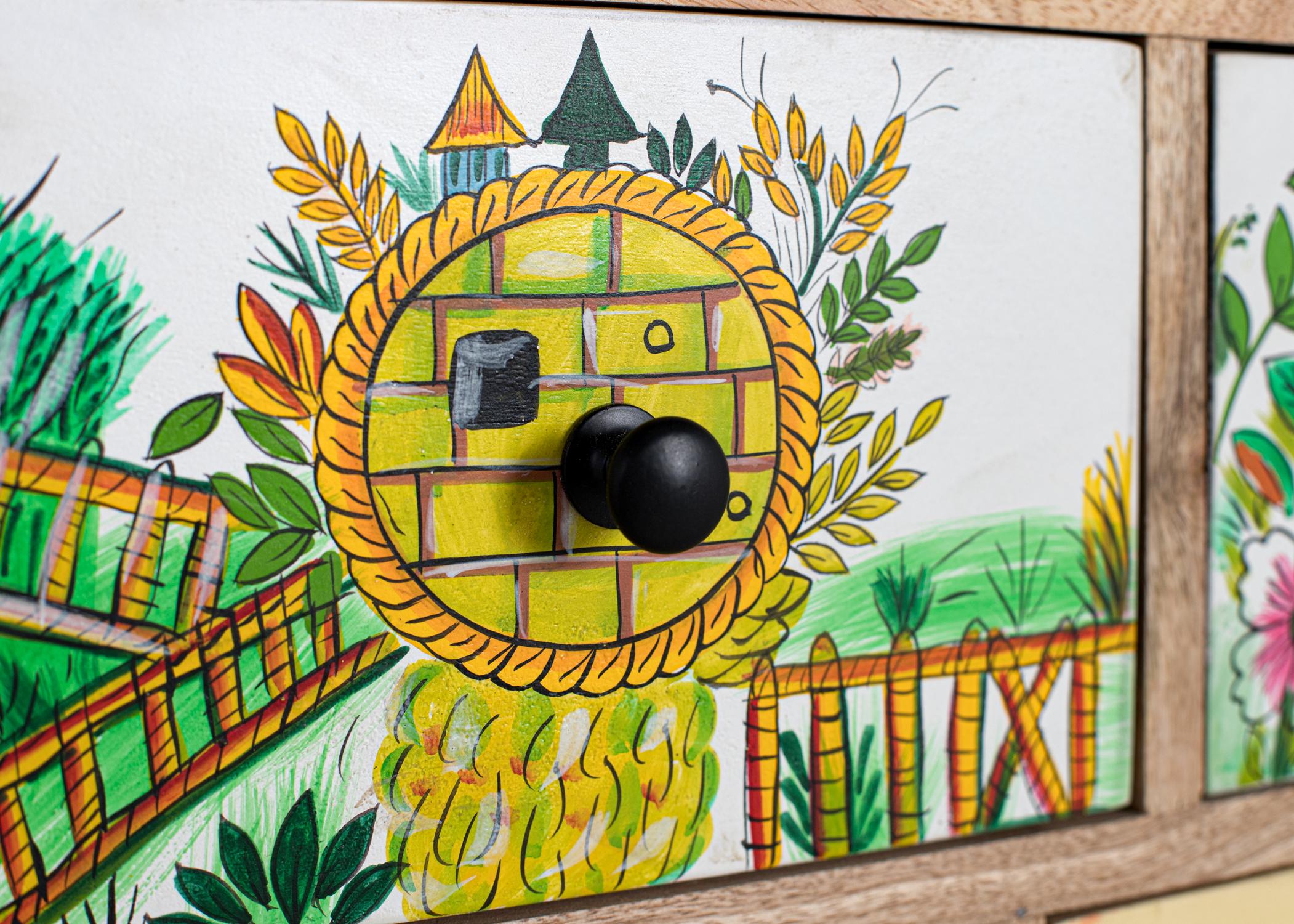 Mangopuusta valmistettu lipasto, jolla on erottuva etninen ja käsityöläistyyli. Siinä on erikokoisia laatikoita, joista jokainen on käsinmaalattu eloisilla ja yksityiskohtaisilla kuvioilla. Koristeisiin kuuluu eläimiä, luonnonmaisemia, kukkia, perinteisiä taloja ja fantastisia hahmoja, jotka luovat iloisen ja tarinallisen kokonaisuuden. Käytännöllisen säilytystoiminnon lisäksi se on ainutlaatuinen koriste-esine, joka täyttää minkä tahansa tilan boheemilla viehätysvoimalla ja eksoottisella tunnelmalla. ● Korkeus: 90 cm ● Pituus: 120 cm ● Leveys: 40 cm ● Materiaali: Mangopuu ● Väri: Monivärinen ● Paino: 58 kg ● Laatikon mitat: 96 x 127 x 47 cm ● Ei vaadi kokoamista