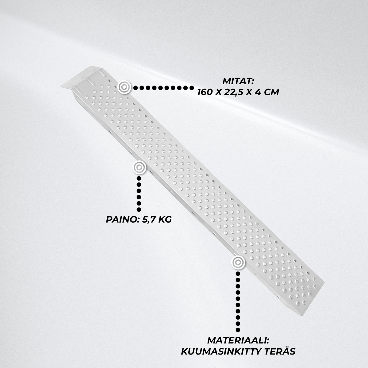 Vahva sinkitty teräsrakenne suojaa rampin pintaa korroosiolta ja kulumiselta. Tämä varmistaa, että ajoramppi säilyttää lujuutensa ja turvallisuutensa myös ulkokäytössä ja vaihtelevissa sääolosuhteissa.
