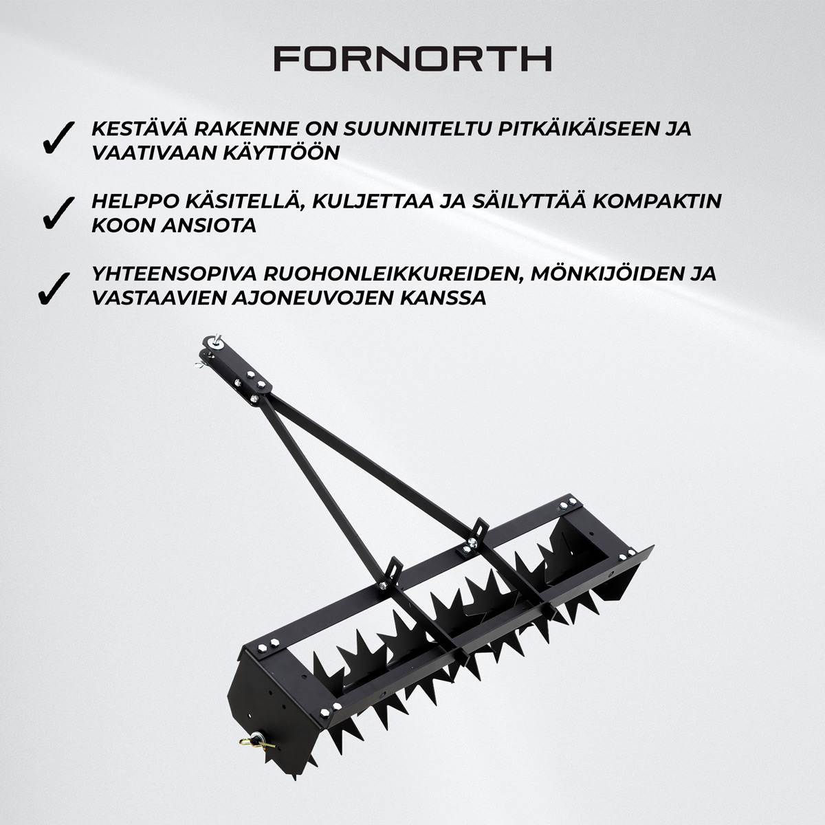 Fornorth Nurmikon Ilmaaja on tehokas ja vaivaton tapa parantaa nurmikkosi kuntoa ja saada tiheämpi, vihreämpi ja kestävämpi lopputulos. Kun maaperä pääsee hengittämään, nurmen juuristo voi paremmin ja kasvu vahvistuu. Ajoneuvoon kiinnitettävä rakenne tekee työstä nopeaa myös suurilla alueilla, ja kestävä teräsrunko varmistaa pitkän käyttöiän. CE- ja REACH-sertifioinnit tukevat turvallista, laadukasta ja ympäristövaatimukset täyttävää käyttöä. Kompaktin kokonsa ansiosta laite on helppo säilyttää, kun se ei ole käytössä.