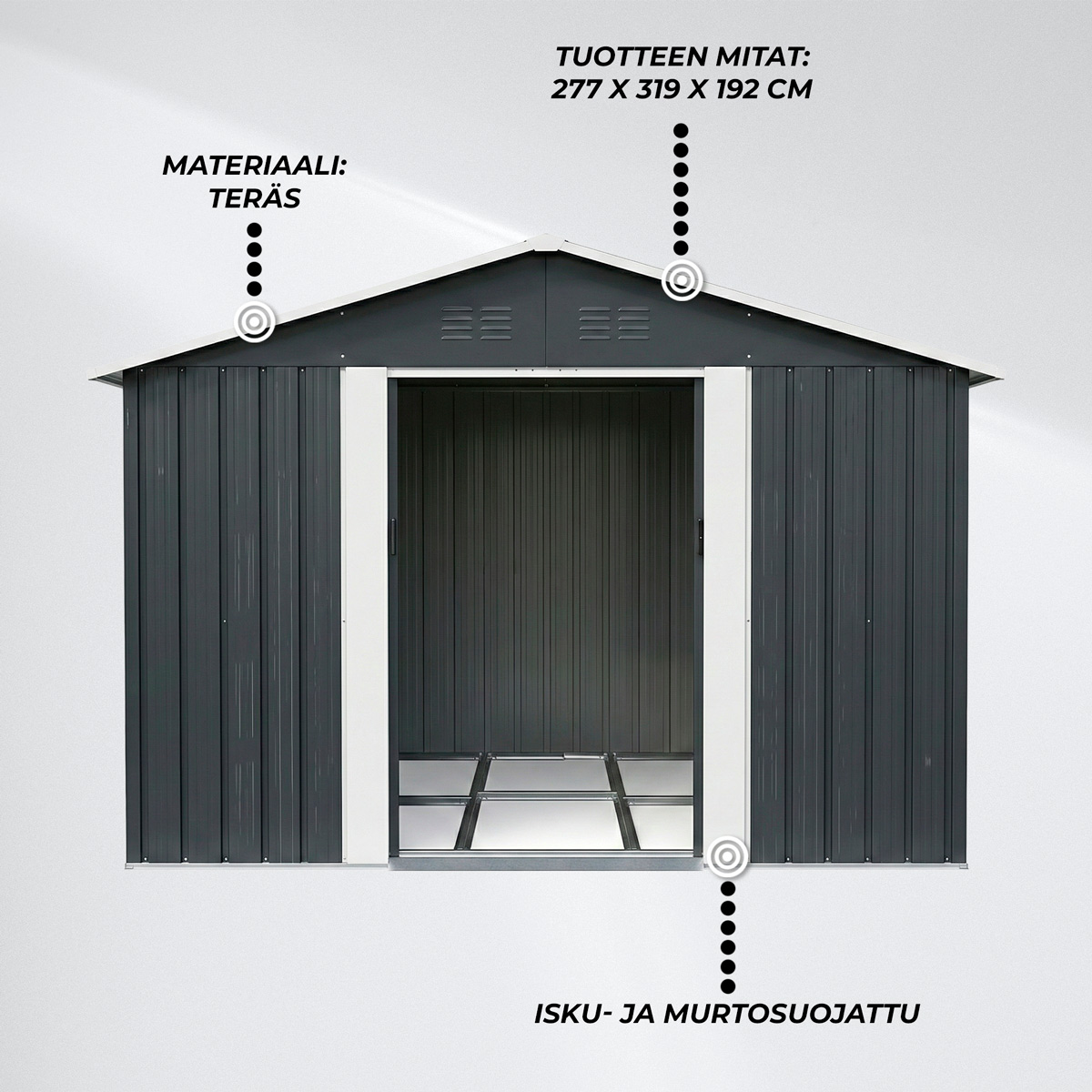 Pihavarasto, joka tuo järjestyksen ja suojan pihaan: 8,84 m² ratkaisu puutarhakalusteille, työkaluille ja tarvikkeille – kestävästä teräksestä, helppokäyttöisillä liukuovilla ja tukevalla rakenteella.