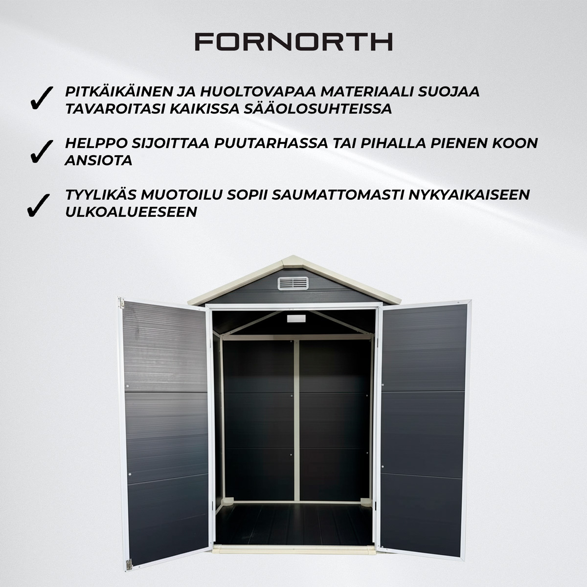 Fornorth suunnittelee tuotteita, jotka tekevät projekteista helpompia ja lopputuloksesta kestävämmän. Olipa kyseessä pihan järjestely, rakentaminen tai säilytysratkaisujen optimointi, Fornorth yhdistää toimivuuden, kestävyyden ja modernin muotoilun. Luotettu niin harrastajien kuin kokeneiden tekijöiden keskuudessa – Fornorth auttaa sinua rakentamaan ympäristösi juuri sellaiseksi kuin haluat.