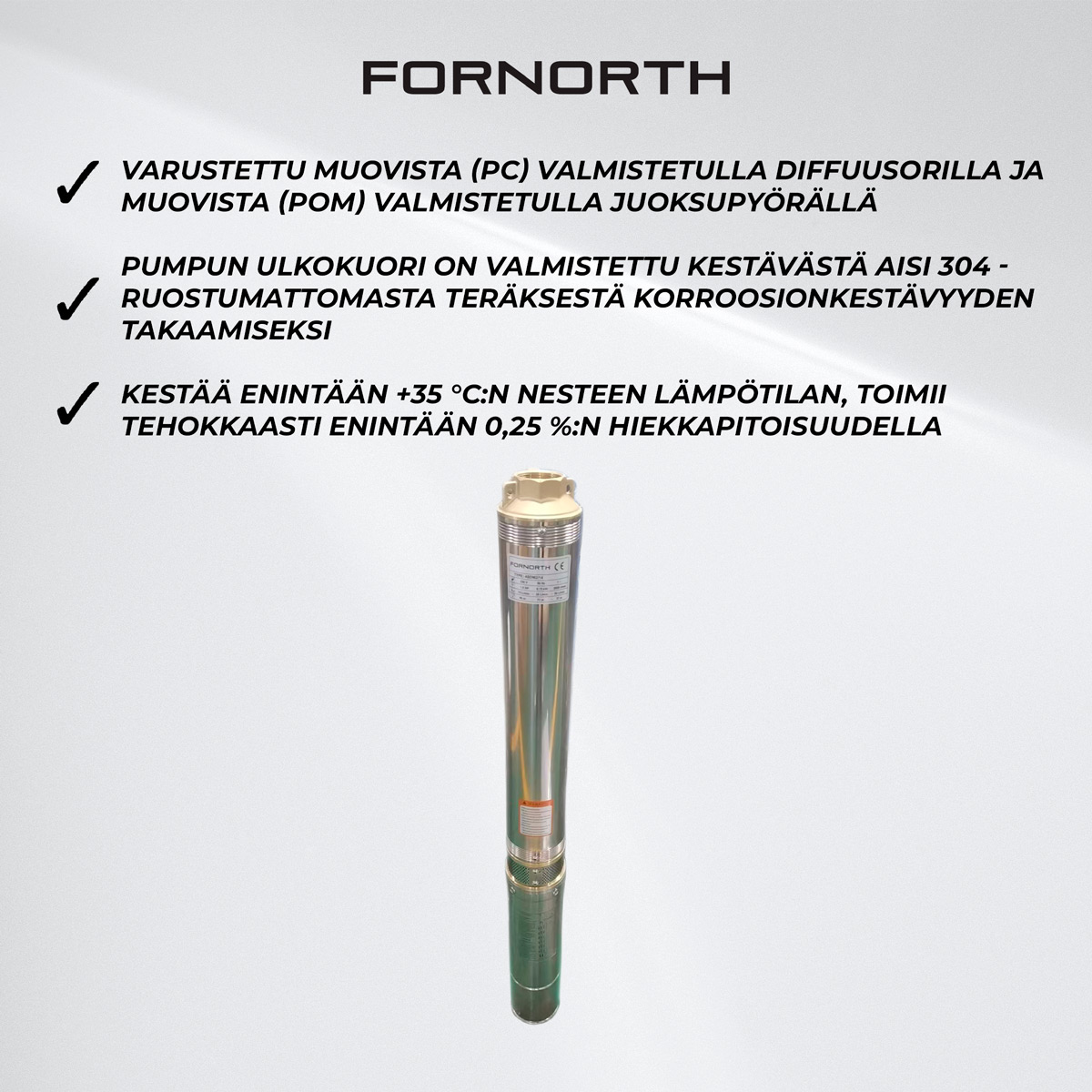 Fornorth Porakaivopumppu toimii luotettavasti jopa +35°C lämpötilassa ja 0,25 % hiekkapitoisuudessa, joten se soveltuu monenlaisiin kaivoihin ja vedenhankintasovelluksiin.