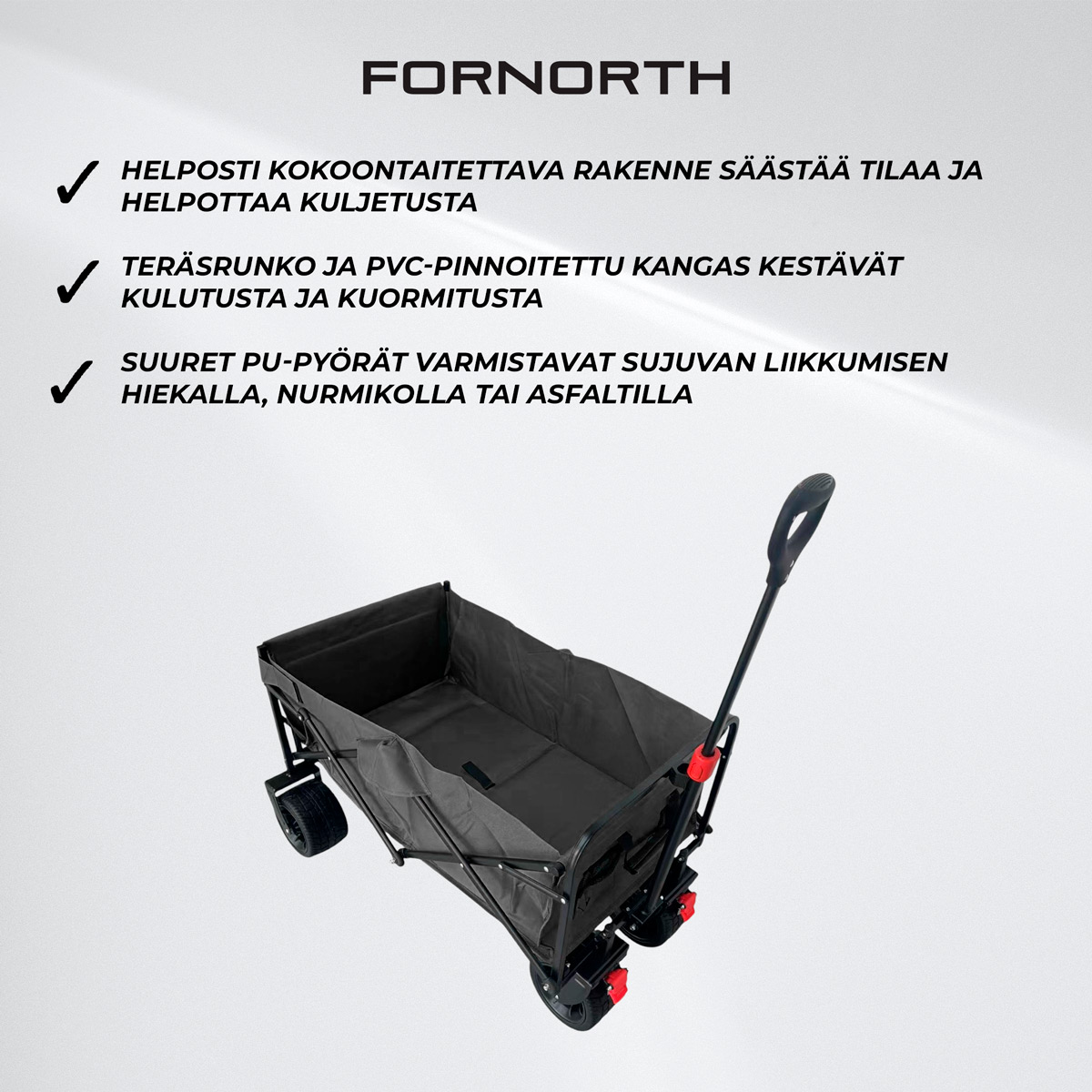 <ul> <li>Kestävä ja monikäyttöinen puutarhakärry</li> <li>Helppo kuljettaa ja säilyttää</li> <li>Taitettava, kevyt mutta vahva rakenne</li> </ul> FornorthMusta