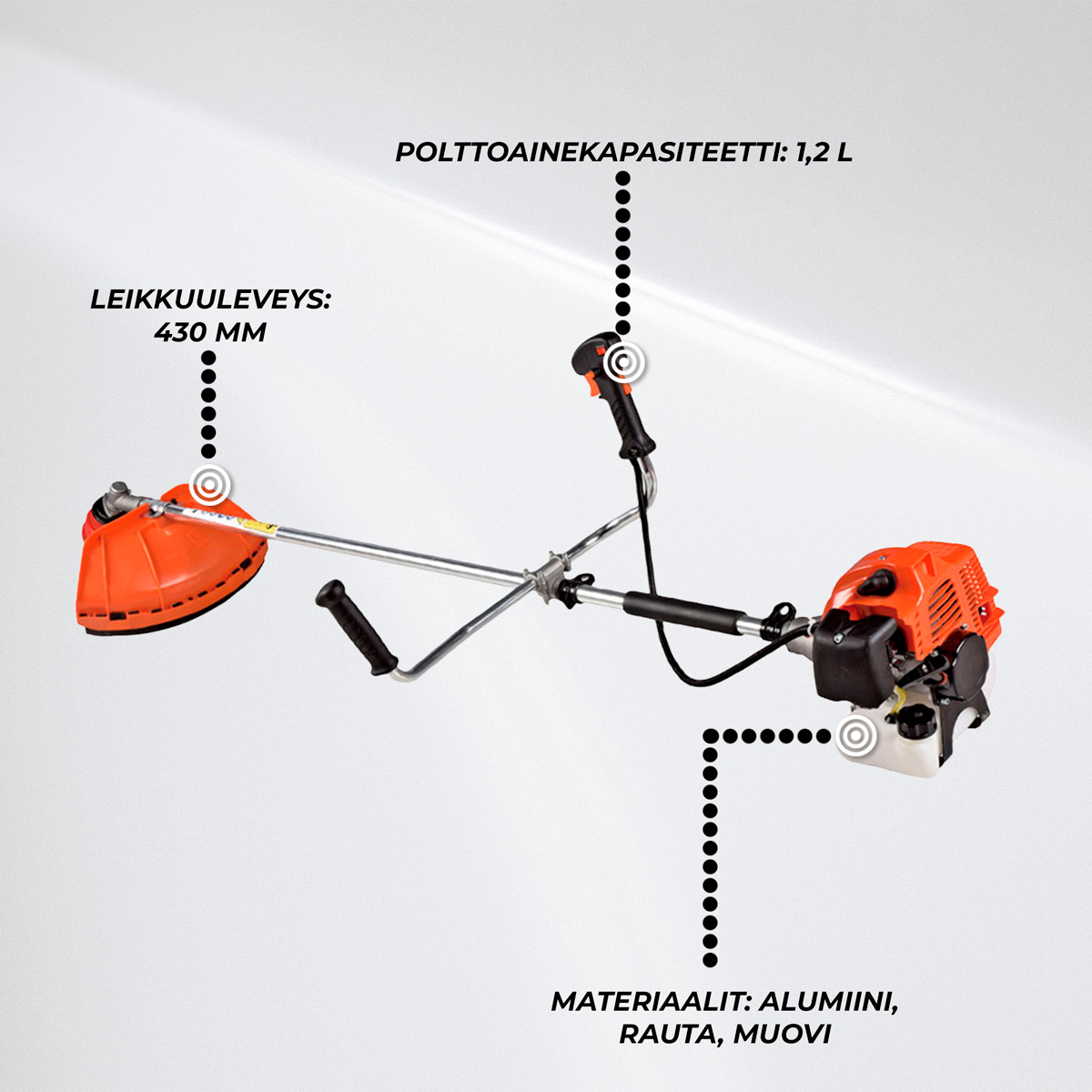 Valmis käyttöön heti: Mukana toimitetaan leikkuupäät, hihna, polttoainekannu, työkalusarja ja käyttöohje – aloittaminen on helppoa ja nopeaa.