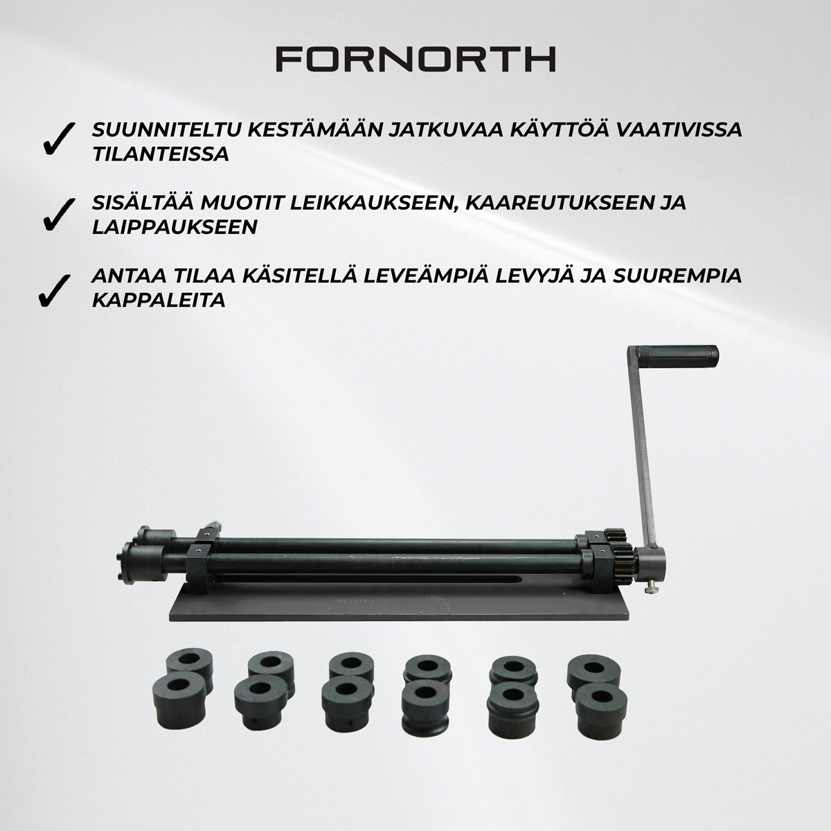 Fornorth Sikkikone 460 mm on erinomainen valinta käyttäjälle, joka tarvitsee luotettavan ja monikäyttöisen metallintyöstökoneen. Sen avulla voit toteuttaa tarkkoja leikkauksia, hallittuja kaareutuksia ja siistejä laippauksia yhdellä ja samalla laitteella.