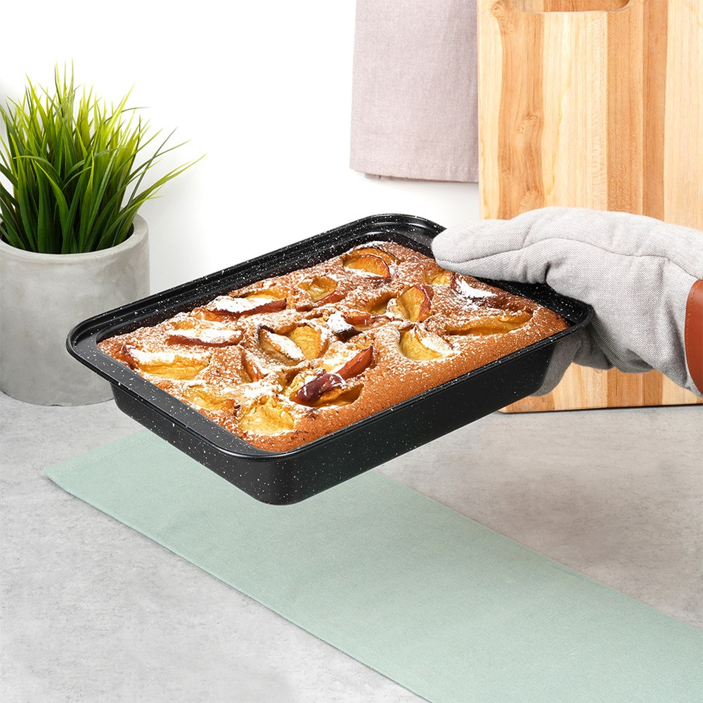 Korkea reuna lisää paistomukavuutta - Korkeat reunat estävät läikkymisen ja helpottavat turvallista käsittelyä. Täydellinen leivontaan suurten täyte- tai taikinamäärien kanssa.