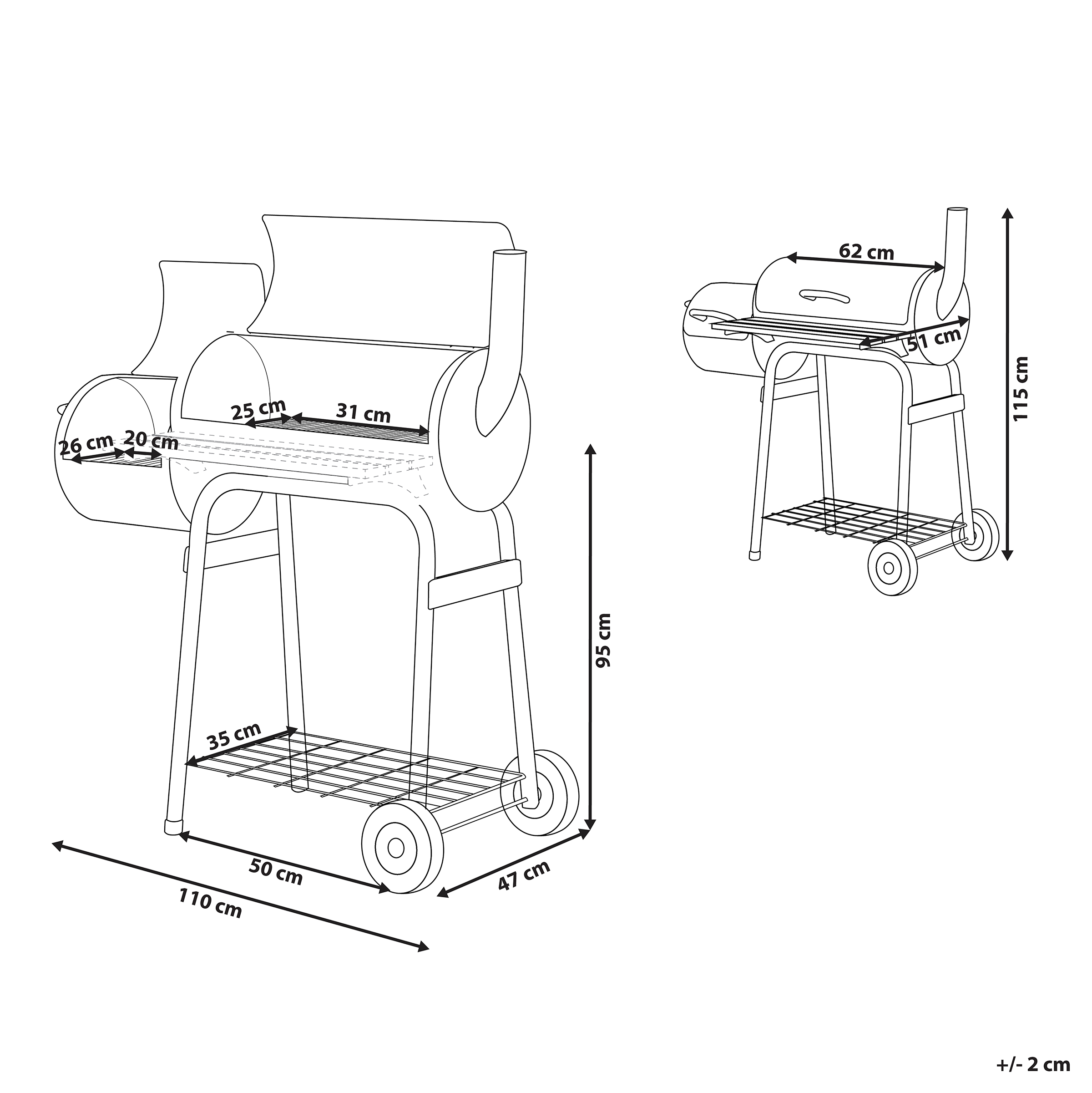 Sylinterin muotoinen grilli savustimella. Tämä hiiligrilli on käytännöllinen valinta ruoanlaittoon puutarhassa tai terassilla, sillä siinä yhdistyvät perinteinen grillaus- ja savustustoiminto. Kestävästä teräksestä valmistettu grilli kestää korkeita lämpötiloja ja takaa pitkän käyttöiän säännölliselläkin käytöllä. Savustimen avulla voit luoda lihaan, kalaan tai vihanneksiin täyteläisen maun ja savuisen aromin, ja se tarjoaa monipuolisen ruoanlaittoratkaisun sekä nopeaan grillaukseen että hitaampaan, makuun keskittyvään ruoanlaittoon. Tukeva runko takaa vakauden grillauksen aikana, ja kaksi pyörää sekä sivukahva mahdollistavat helpon liikuteltavuuden. Yksinkertainen, vähän ylläpitoa vaativa muotoilu tekee puhdistamisesta helppoa jokaisen käyttökerran jälkeen, ja moderni ulkonäkö sopii erinomaisesti erilaisiin ulkotiloihin, tehden grillist- täydellisen kaikille, jotka nauttivat ruoanlaitosta ulkona.
