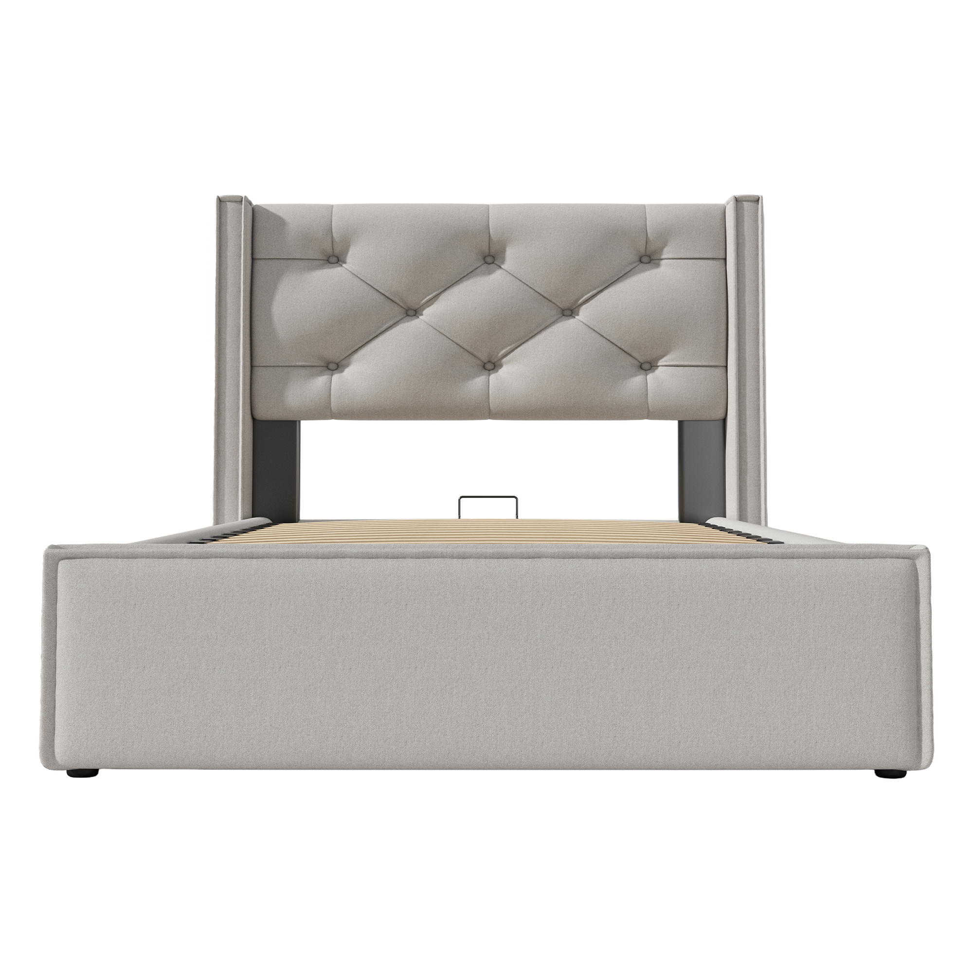 Hydraulinen verhoiltu yhden hengen sänky, 90x200 cm, säilytystilalla, vaaleanharmaa puuvilla
