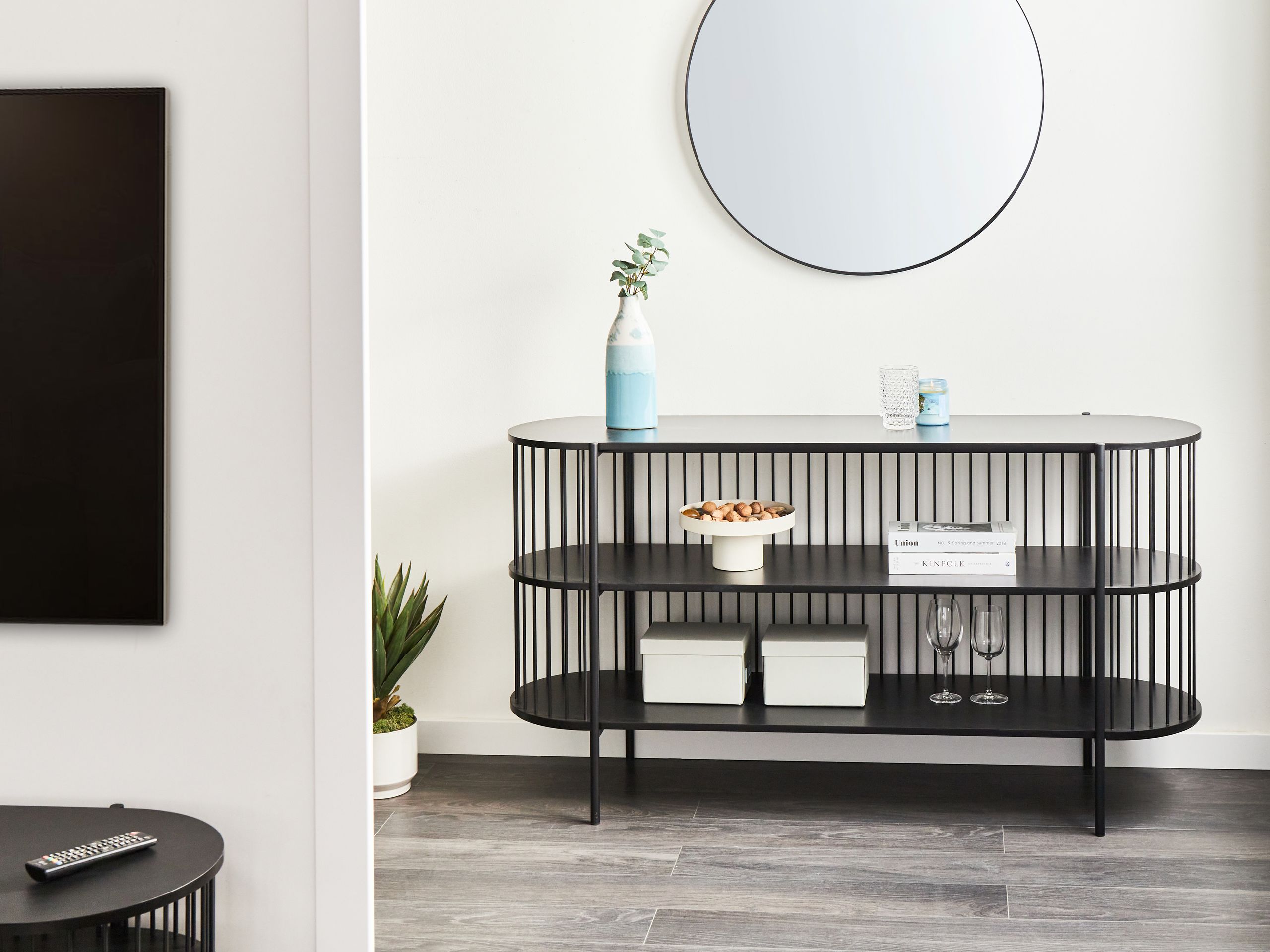 Ominaisuudet: Avonainen hylly helpottaa pääsyä, Koristeellinen mutta käytännöllinen, Moderni muotoilu, Katseen kiinnittävä sisustuselementti, Vankka käsityö, Runsaasti säilytystilaa
