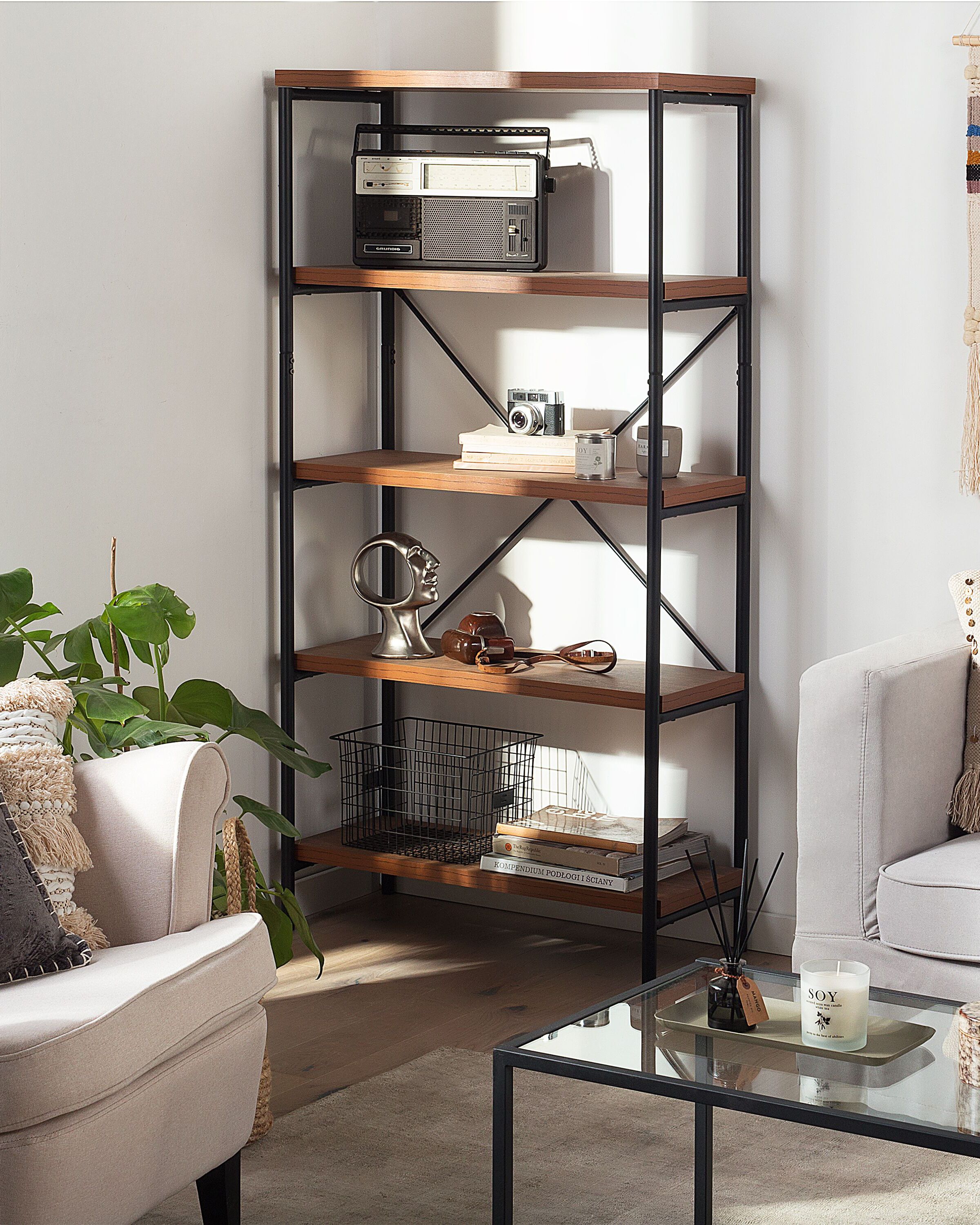 Industriaalinen avonainen hyllykkö. Pieni, kompakti ja tukeva kirjahylly on erinomainen lisä kaikenkokoisiin tiloihin, oli tila sitten olohuone tai makuuhuone. Aseta kirjahyllyn neljälle hyllylle kirjoja, koriste-eineitä tai muita kodin esineitä, jotka tarvitsevat säilytyspaikan.