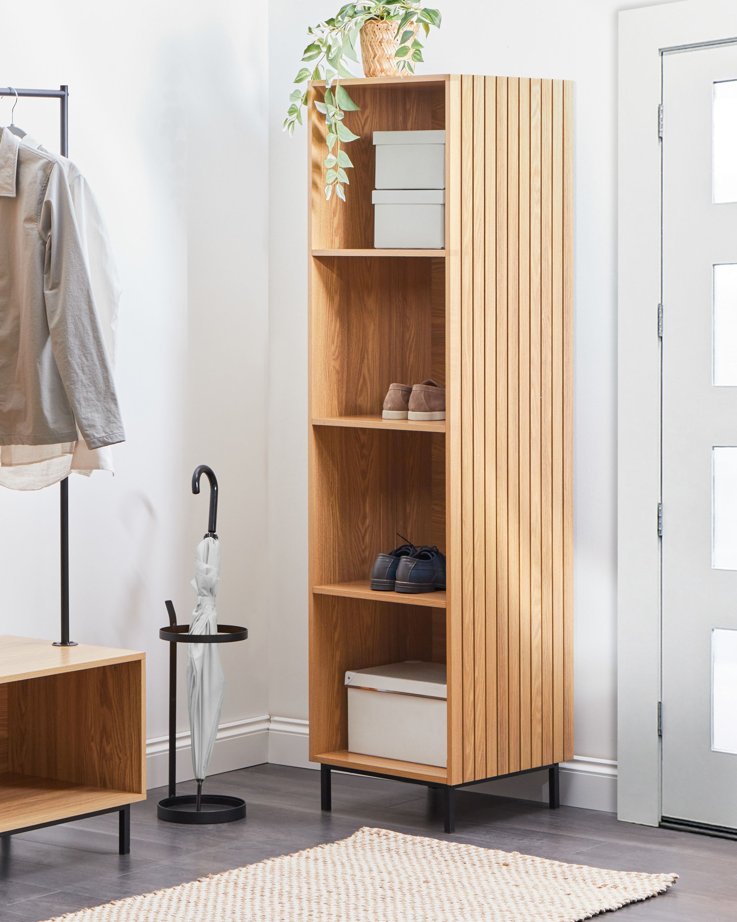 Modulaarinen hyllykkö eteiseen. Tämä monipuolinen hylly on erinomainen lisä kotiin, ja se tarjoaa käytännöllistä säilytystilaa neljällä tilavalla hyllyllään. Sen runko on valmistettu puuta muistuttavalla paperiviilulla viimeistellystä MDF-levystä, ja mustat jalat ovat vankkaa rautaa, minkä ansiosta se yhdistää kestävyyden ja ajattoman muotoilun. Hylly sopii täydellisesti modulaarisen avovaatekaapin yhteyteen eteisessä tai makuuhuoneessa, ja se toimii mainiosti myös kirjojen ja muiden esineiden esittelijänä olohuoneessa, sisustustyylistä riippumatta.
