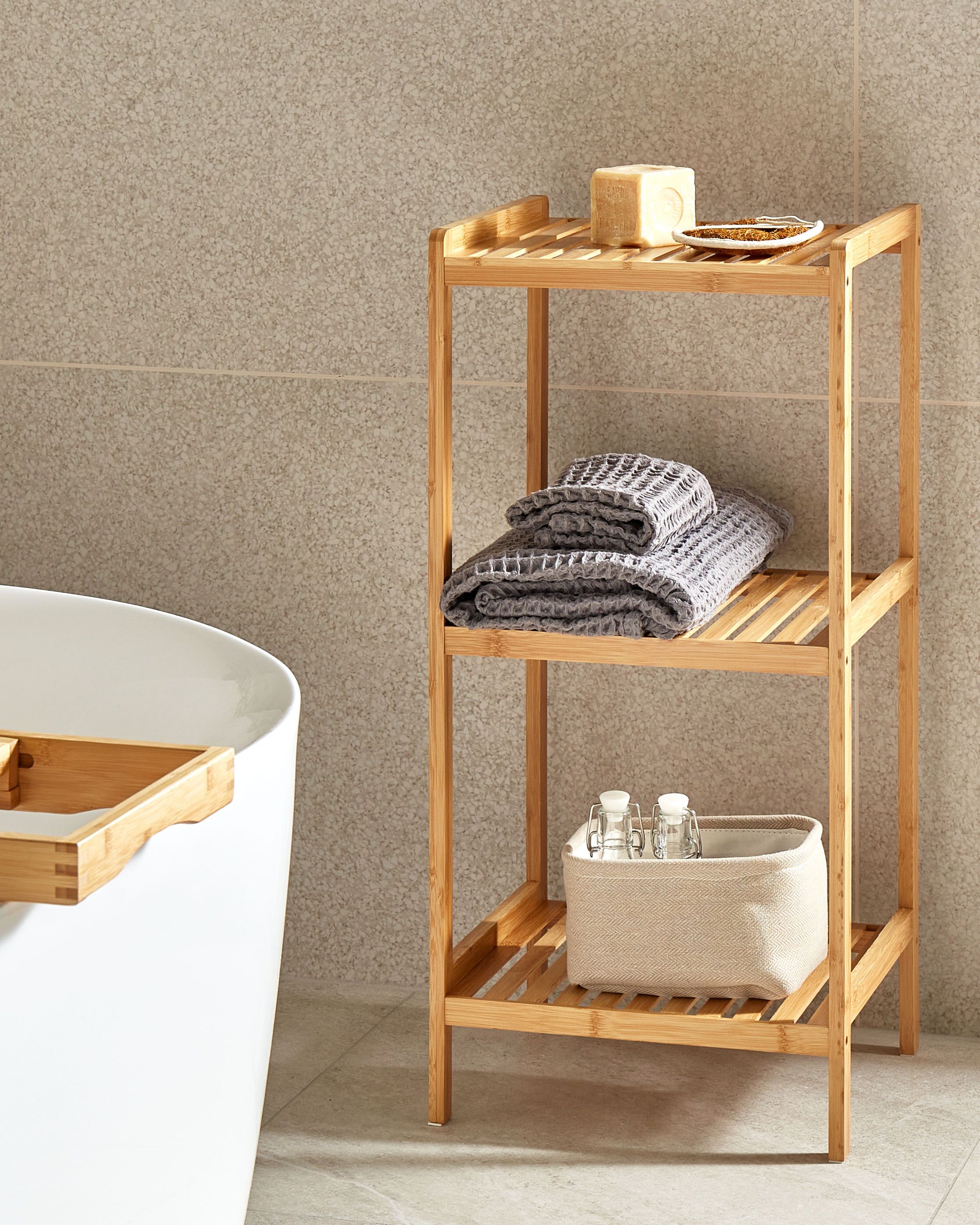 Luonnollinen kylpyhuoneen hylly. Tämä vapaasti seisova hylly on valmistettu vaaleasta bambusta, joka tarjoaa kestävyyttä ja lämmintä, minimalistista estetiikkaa. Kolme lamellihyllyä tarjoavat runsaasti tilaa pyyhkeille, hygieniatuotteille ja muille tarvikkeille, kun taas avoin muotoilu takaa optimaalisen ilmankierron. Kompaktin ja kevyen rakenteensa ansiosta hylly sopii erinomaisesti kaiken kokoisiin kylpyhuoneisiin, tuoden niihin ripauksen orgaanista tyyliä, joka täydentää muuta sisustusta.