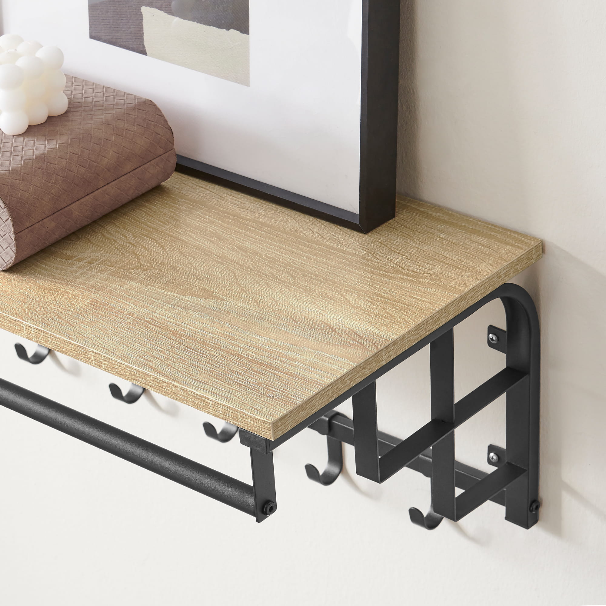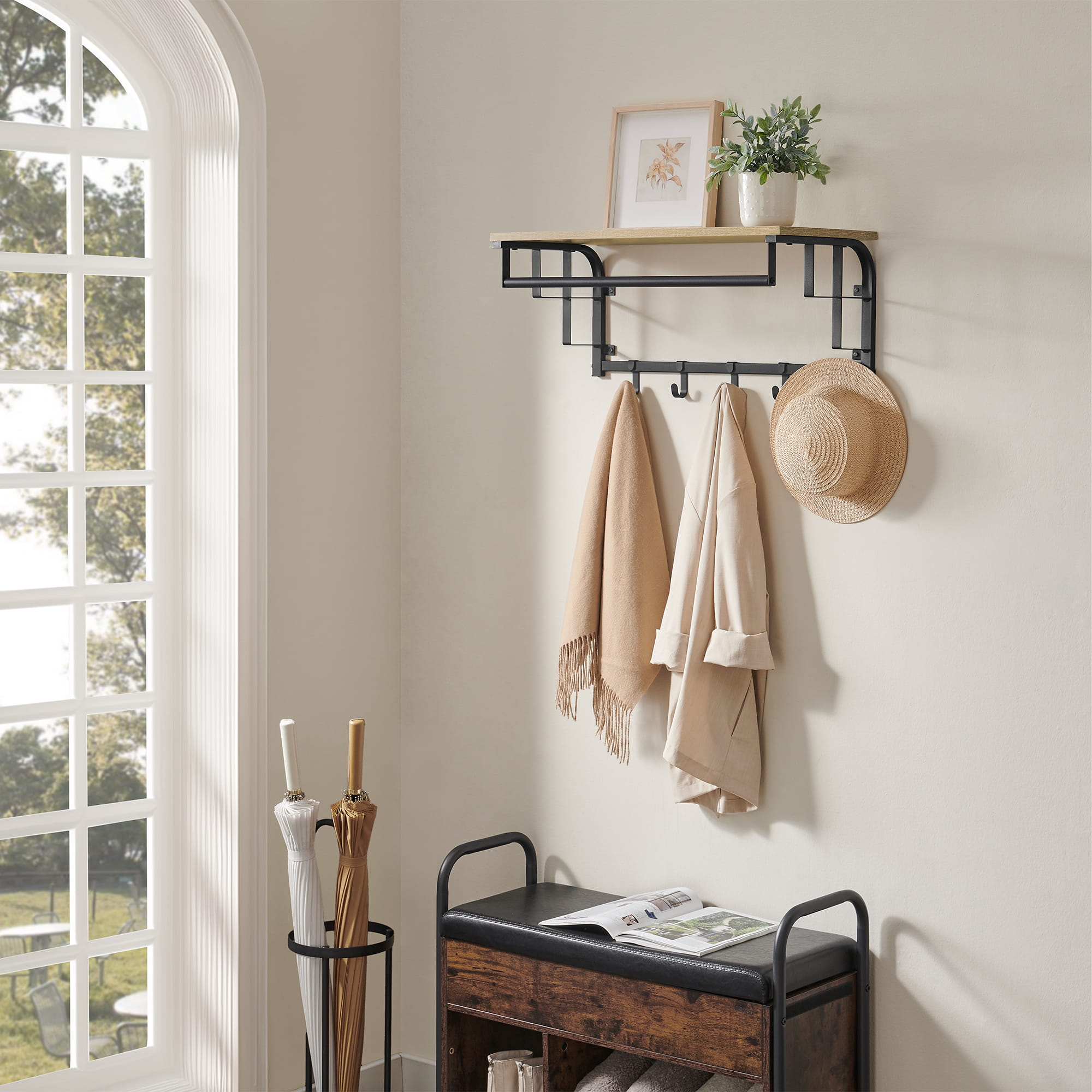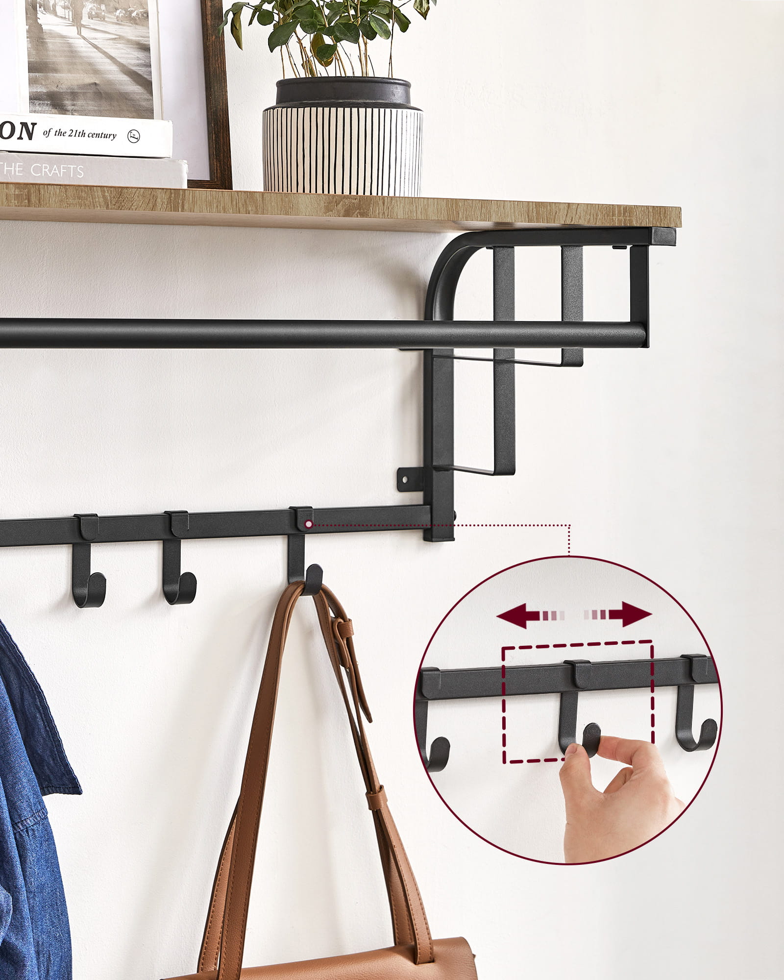 Tässä tilaa säästävässä tuotteessa on ___HtM1P14CEhO1D3R__ vakaa hylly, jolle voit asettaa ruukkukasveja, sateenvarjoja, reppuja, hattuja, lippiksiä tai esitellä kauniisti kehystettyjä valokuviasi. Lisäksi tuotteessa on viisi koukkua ___HtM1P14CEhO1D3R__ takkien, pussien, laukkujen tai avainten säilyttämistä varten sekä vakaa tanko ___HtM1P14CEhO1D3R__, johon voit ripustaa vaatehenkarille asetettuja takkeja ja päällystakkeja.