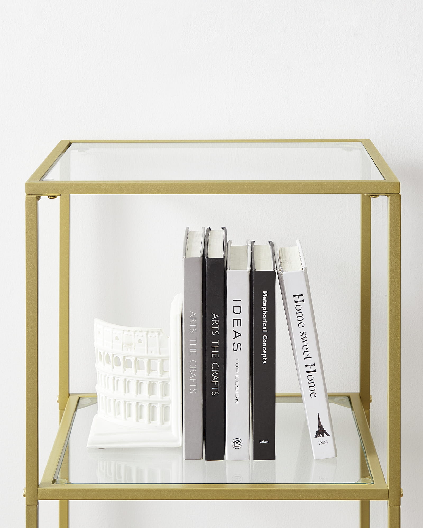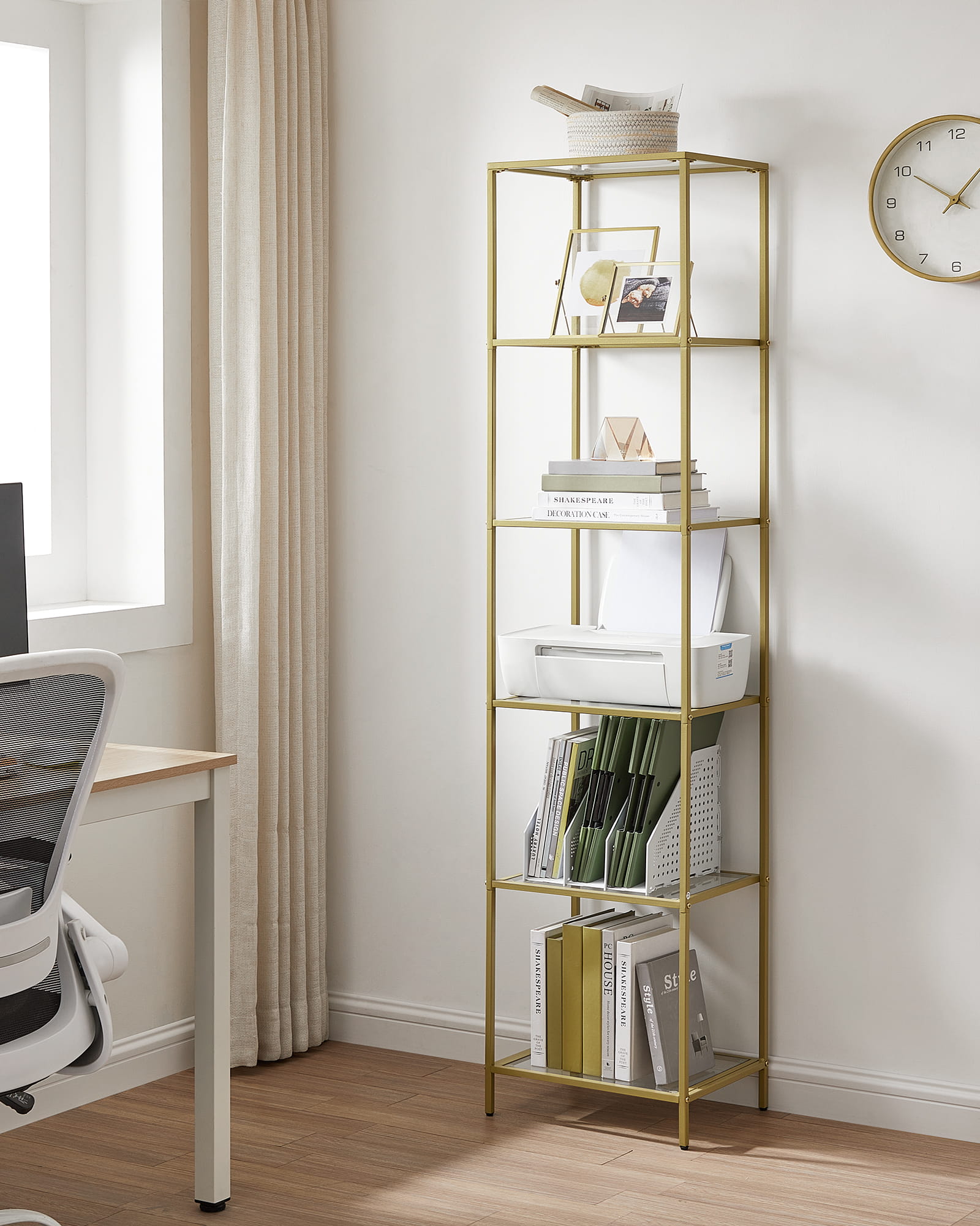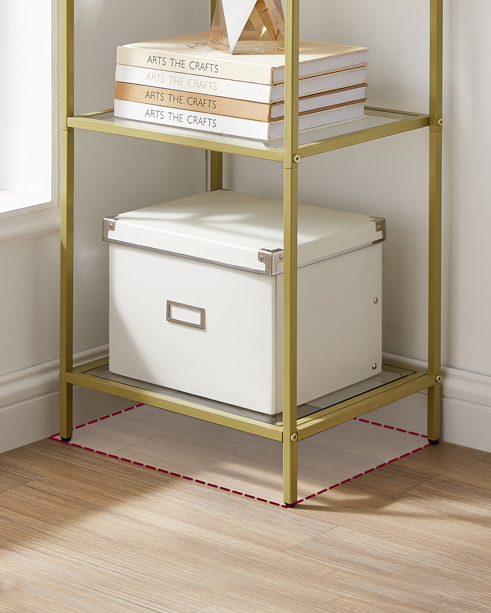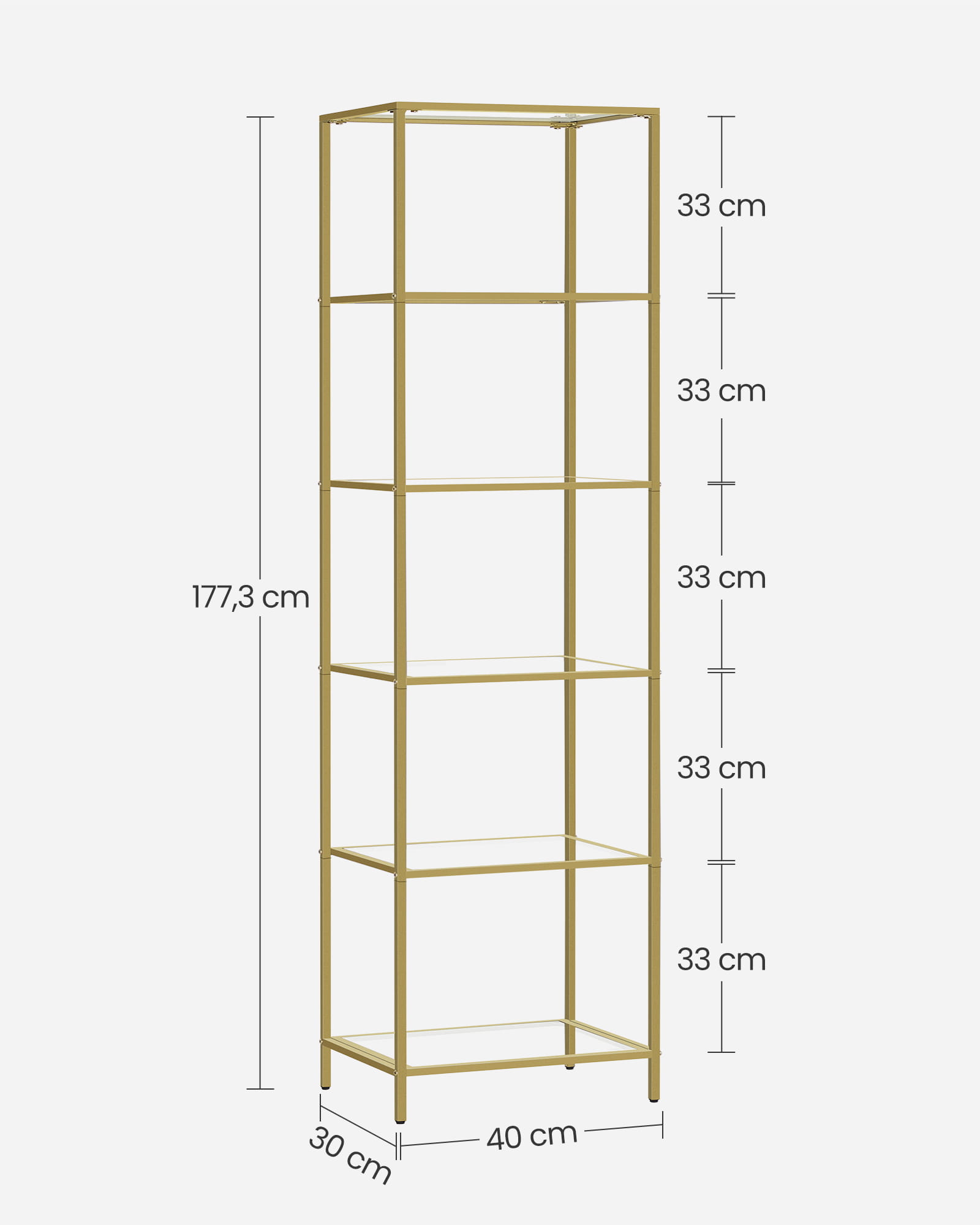 Moderni, ylellinen ja silti pelkistetty hyllykkö, jossa on kullanvärinen pulverimaalattu teräsrunko ja karkaistusta lasista valmistetut hyllytasot. Kuusi tasoa pitää suosikkisi käden ulottuvilla – kirjat, maljakot, koristeet, lelut ja valokuvakehykset. Sopii olohuoneeseen, makuuhuoneeseen, eteiseen, kotitoimistoon tai keittiöön.