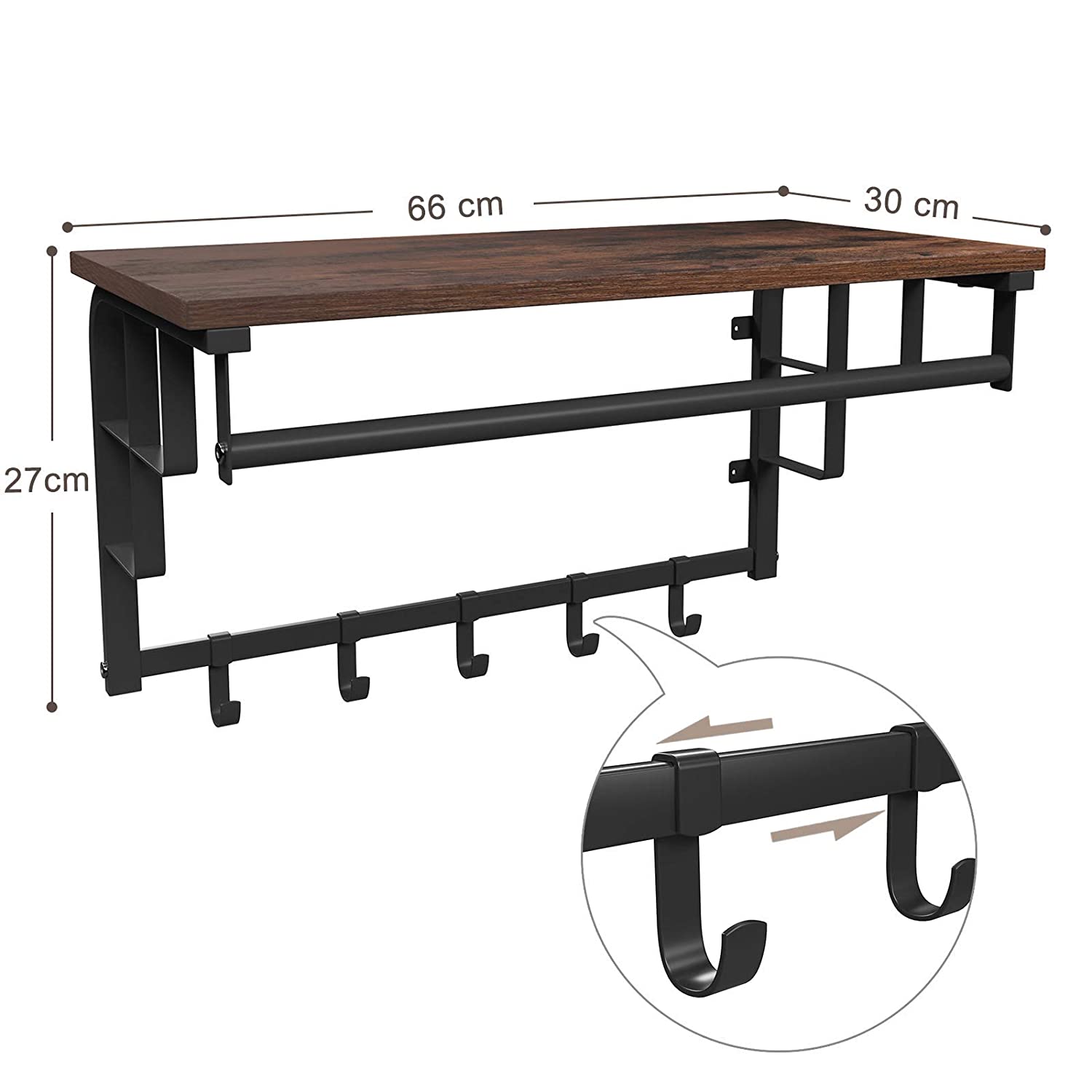 Tilaa säästävä seinähylly, joka auttaa pitämään eteisen järjestyksessä. Ylähyllylle mahtuvat viherkasvit, koristeet tai valokuvat. Viisi koukkua ja tukeva ripustustanko tarjoavat paikat takeille, laukkuille ja asusteille. Metallinen runko lisää kestävyyttä – toimii erinomaisesti myös raskaammille talvivaatteille.