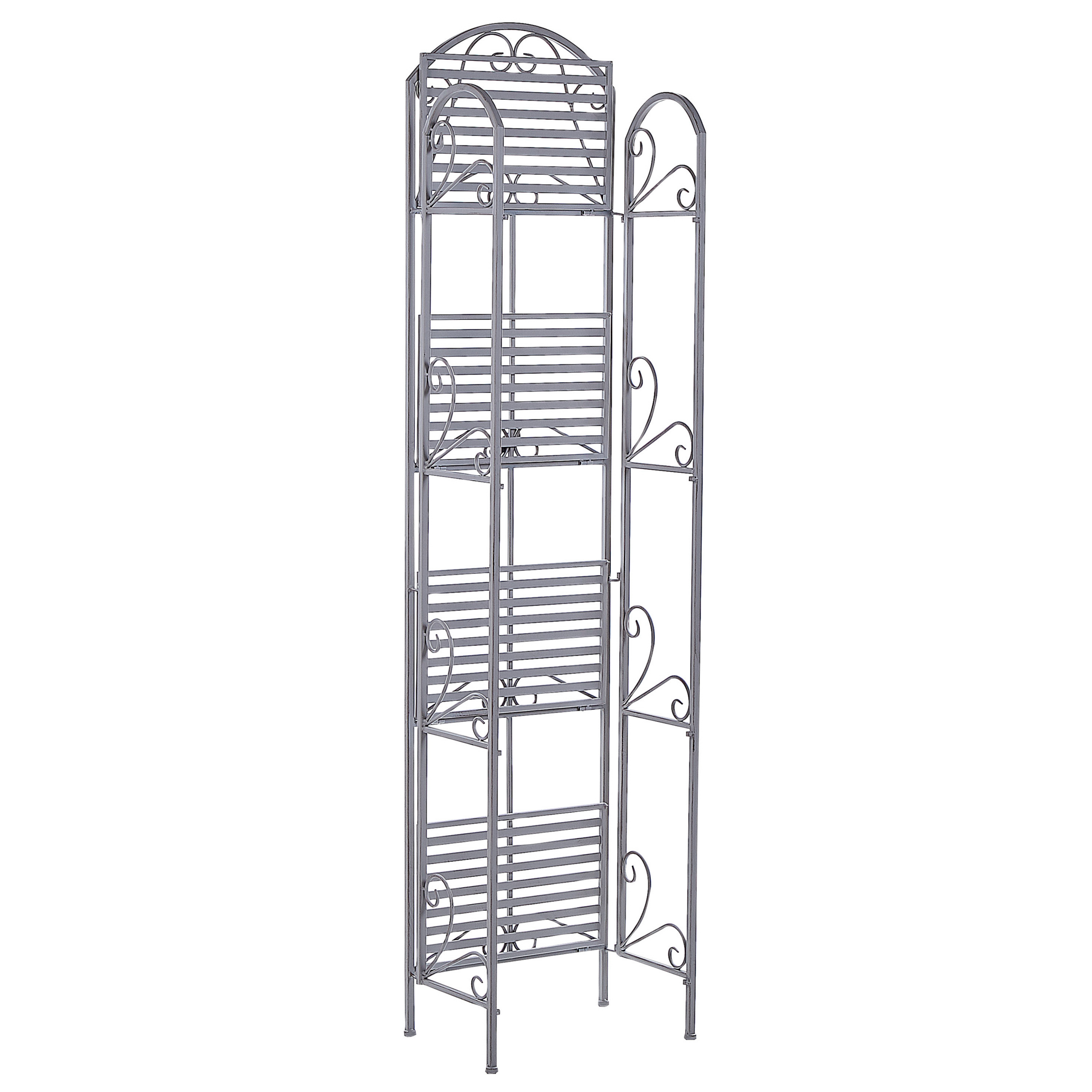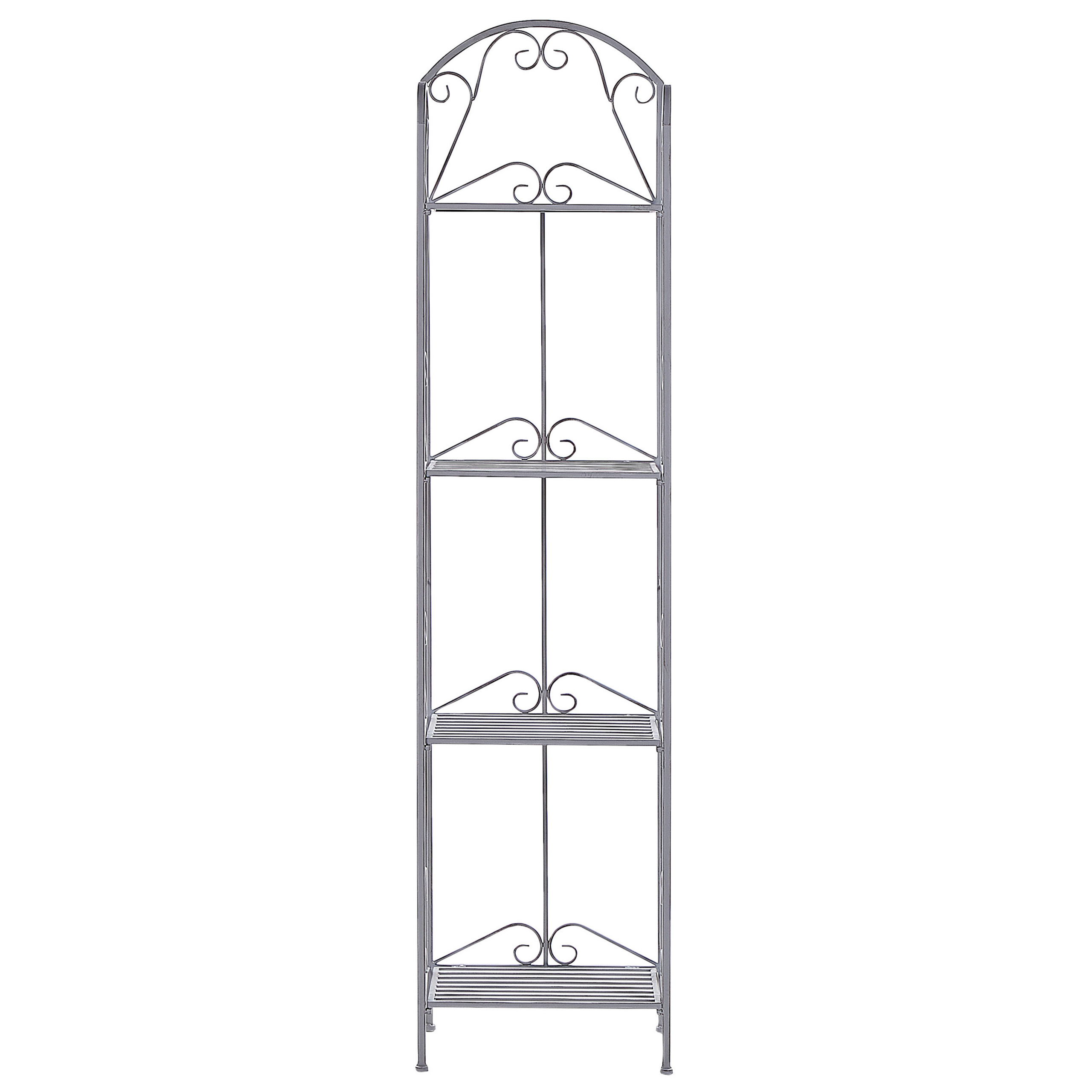 Retrotyylinen haalistuneen värinen hylly. Tämä neljällä hyllyllä varustettu hylly sopii moniin erilaisiin tiloihin, kylpyhuoneesta eteiseen tai parvekkeelle. Se on valmistettu harmaaksi jauhemaalatusta raudasta, jonka ansiosta hylly on erittäin vakaa ja helppohoitoinen. Kauniit, vintage-tyylin inspiroimat kuviot, haalistunut viimeistely ja elegantti muotoilu saavat hyllyn sopimaan loistavasti sekä moderneihin että retrotyylisiin sisustuksiin.