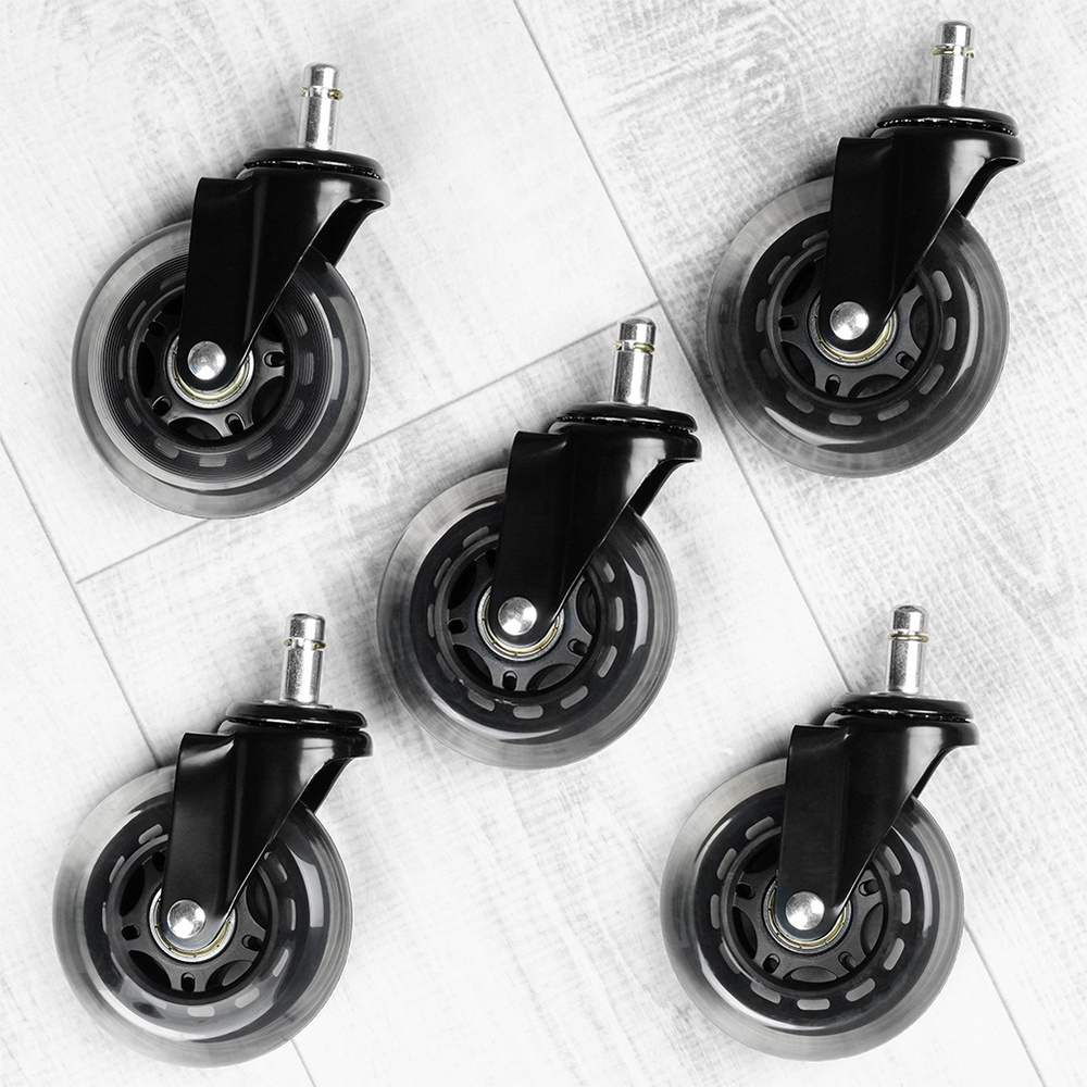 5 kpl työtuolin vaihtopyöriä - Viiden kpl työtuolin vaihtopyöriä. Kunkin pyörän halkaisija on 7,5 cm. Kiinnitystapin halkaisija on 10 mm. Ne varmistavat tuolin hiljaisen ja tasaisen liikkeen.