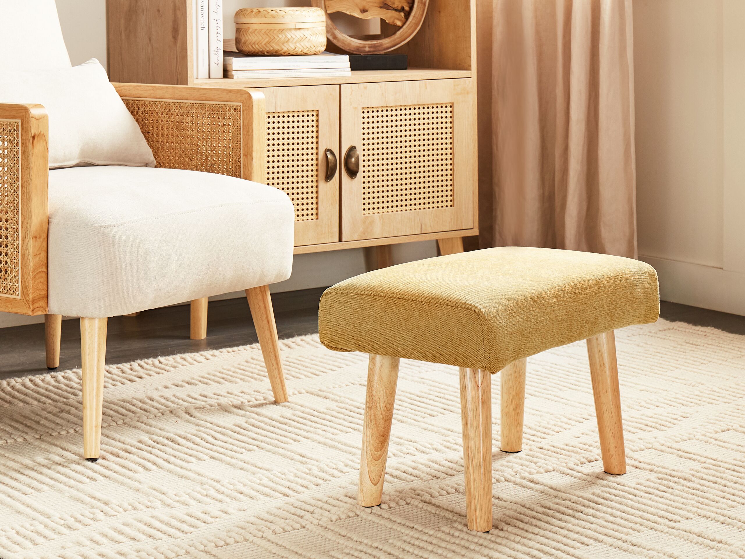 Moderni käytännöllinen jakkara. Ainutlaatuisen, retrotyylisen muotoilun omaava jakkara on täydellinen lisä olohuoneeseen tai makuuhuoneeseen. Sen tukeva vaneripuusta tehty runko ja sirot, tammipuiset jalat takaavat kestävyyden. Ihanan pehmeä, keltaisen värinen polyesteriverhoilu saa jakkaran sopimaan erityisen hyvin skandinaavisiin sisustuksiin.