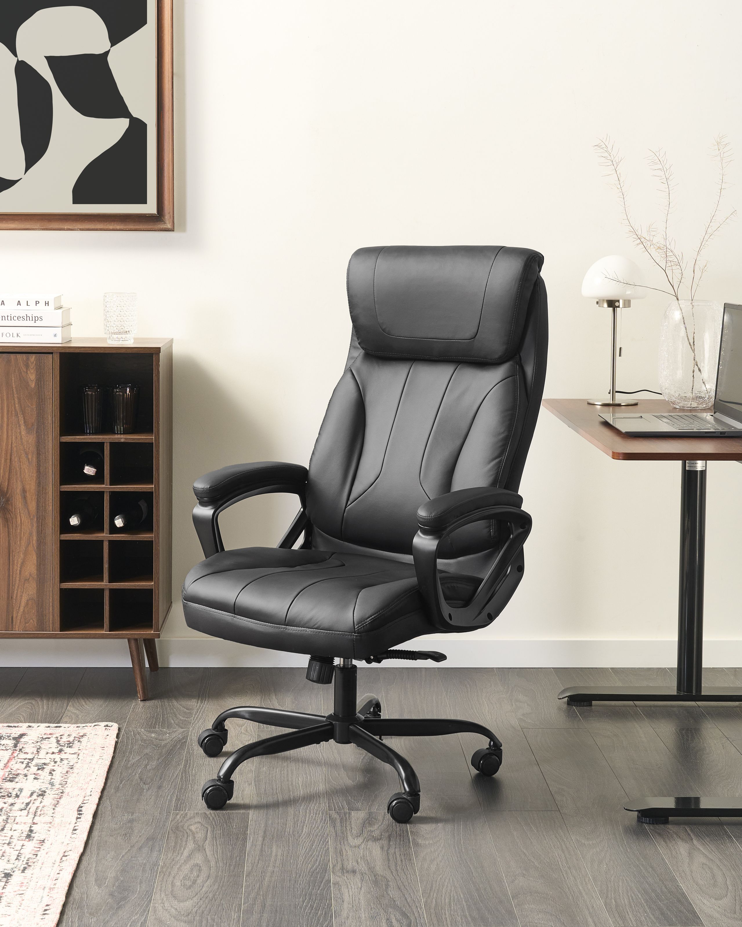 Perinteinen ergonominen pehmustettu toimistotuoli. Tämä tyylikäs toimistotuoli tarjoaa täydellisen tasapainon mukavuuden ja toiminnallisuuden välillä. Kestävällä keinonahalla verhoiltu tuoli on helppohoitoinen ja tuo tilaan modernia ilmettä. Säädettävän korkeuden ja kallistustoiminnon ansiosta se on helppo asettaa haluttuun asentoon pitkien työpäivien aikana, kun taas asennonlukitusmekanismi takaa luotettavaa tukea. 360 astetta kääntyvä istuin lisää joustavuutta ja mahdollistaa sujuvan liikkumisen, joten työskentely on vaivattomampaa. Ergonomisuutta ja tyyliä yhdistävä tuoli sopii täydellisesti sekä toimistossa että kotona työskentelyyn.