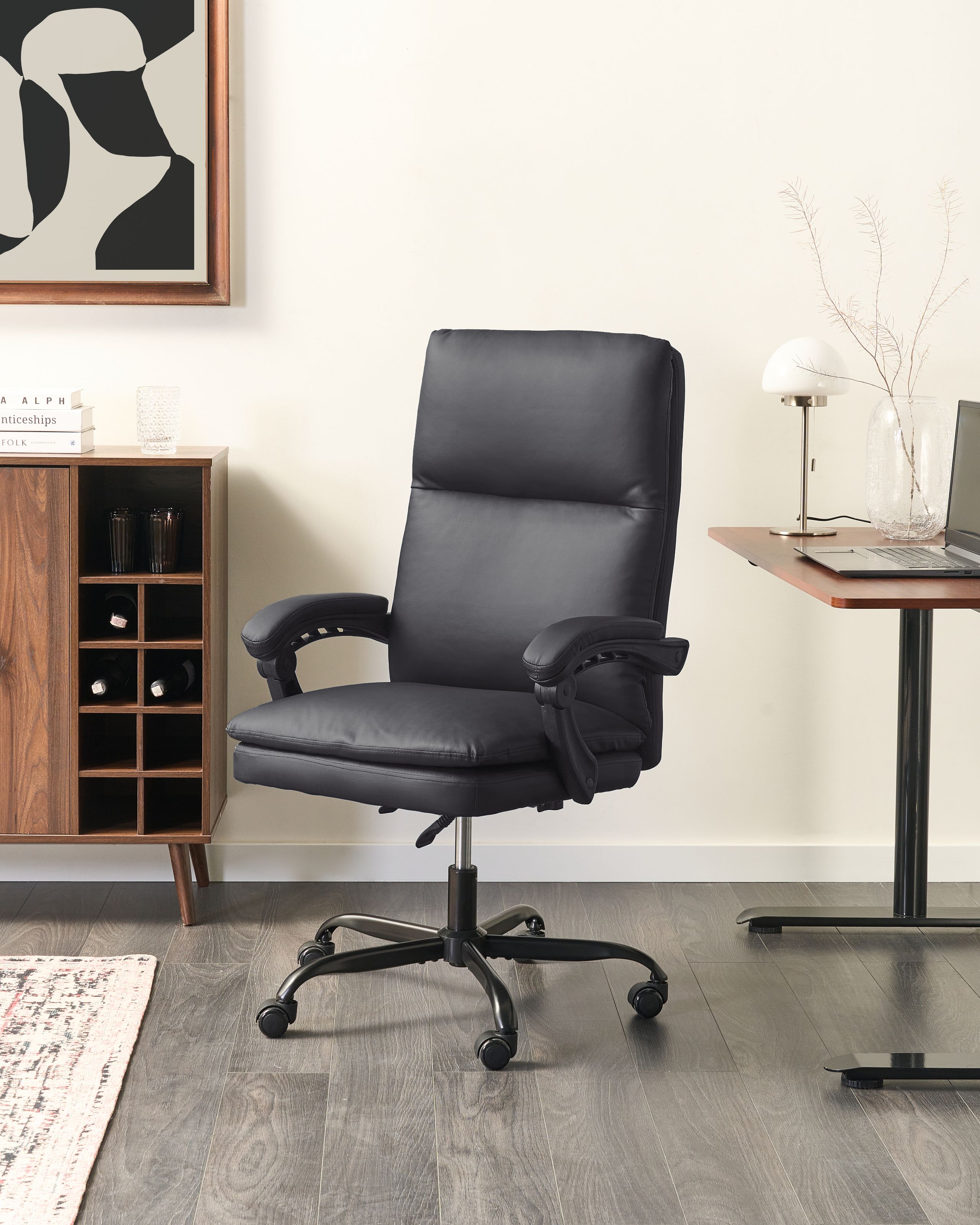 Ergonominen pehmustettu toimistotuoli. Tämä tyyliä ja mukavuutta yhdistävä toimistotuoli on verhoiltu kestävällä keinonahalla ja pehmustettu tukevasti optimaalisen tuen takaamiseksi. Siinä on kallistettava ja säädettävä selkänoja, säädettävä korkeus ja kätevä asennonlukitusmekanismi, joiden ansiosta tuoli mukautuu erilaisiin tarpeisiin koko päivän ajan. Se kohottaa käyttökokemusta toiminnallisuudellaan ja elegantilla ulkonäöllään, käytettiinpä sitä työskentelyyn tai rentoutumiseen.