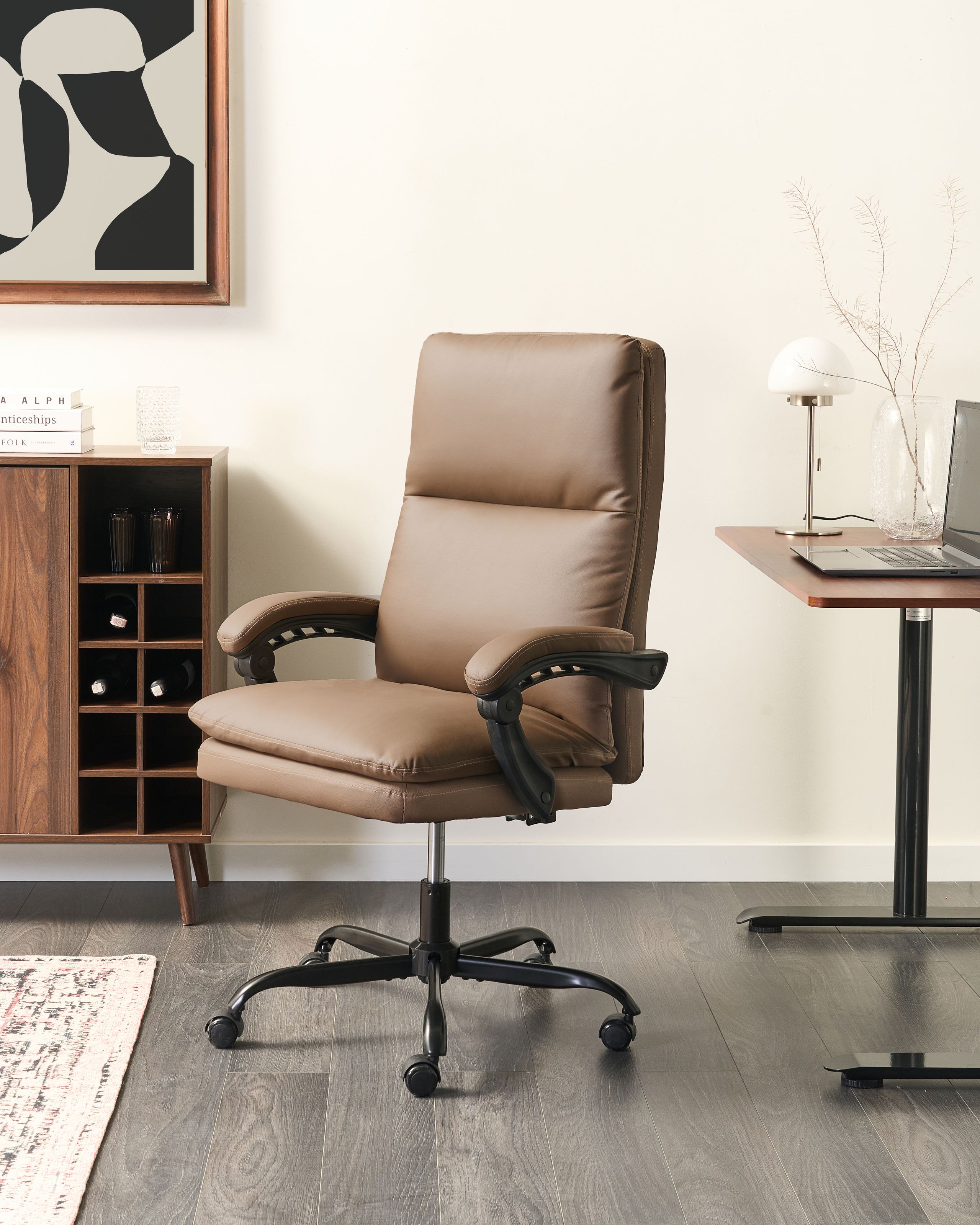 Ergonominen pehmustettu toimistotuoli. Tämä tyyliä ja mukavuutta yhdistävä toimistotuoli on verhoiltu kestävällä keinonahalla ja pehmustettu tukevasti optimaalisen tuen takaamiseksi. Siinä on kallistettava ja säädettävä selkänoja, säädettävä korkeus ja kätevä asennonlukitusmekanismi, joiden ansiosta tuoli mukautuu erilaisiin tarpeisiin koko päivän ajan. Se kohottaa käyttökokemusta toiminnallisuudellaan ja elegantilla ulkonäöllään, käytettiinpä sitä työskentelyyn tai rentoutumiseen.