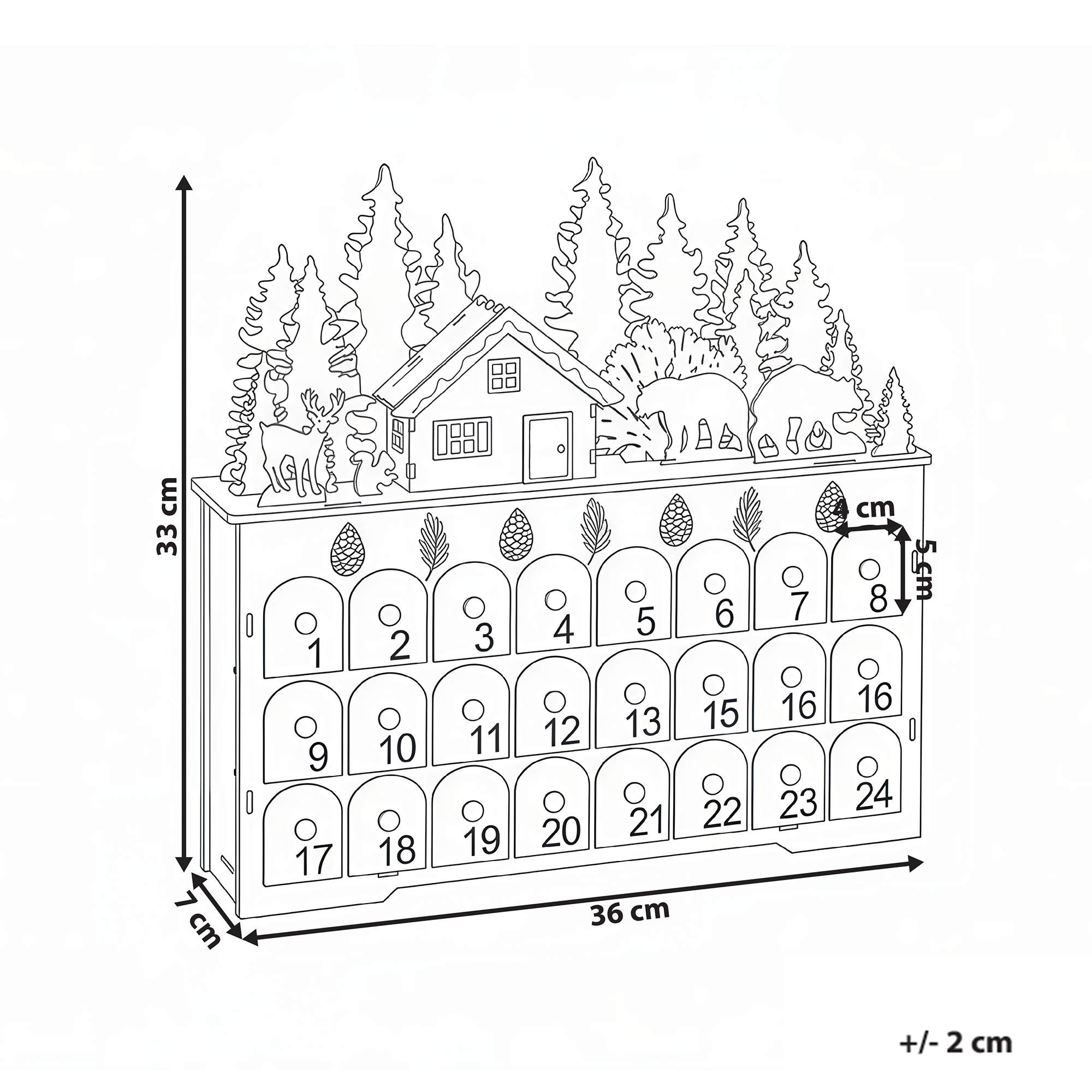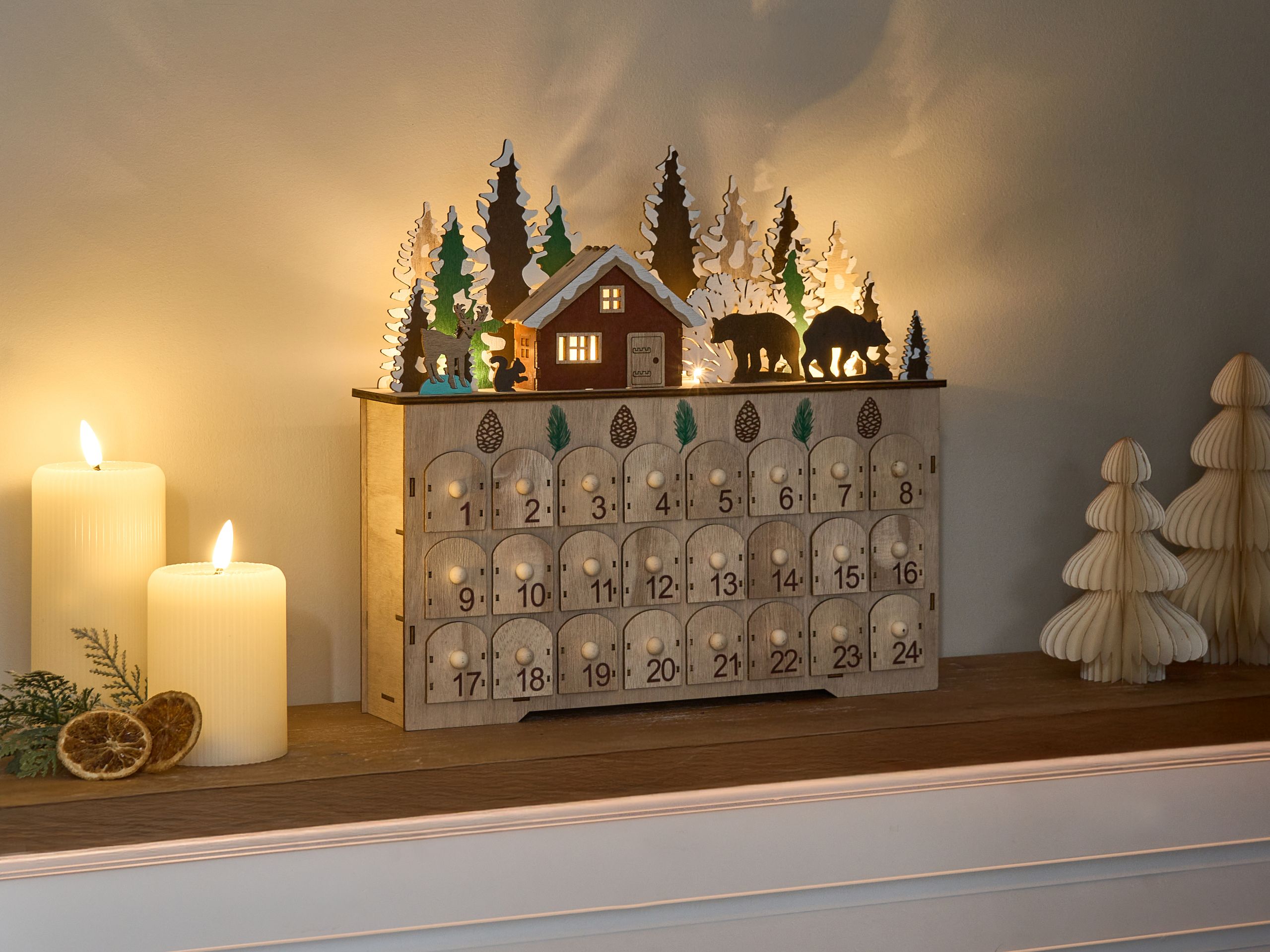Itse täytettävä LED-joulukalenteri talvisella metsällä. Tämä kauniisti käsintehty joulukalenteri tarjoaa upean tavan laskea päiviä jouluun. Siinä on 24 numeroitua, itse täytettävää lokeroa, jotka sopivat erinomaisesti herkkujen ja pienten lahjojen piilottamiseen. Integroidut lämpimänsävyiset LED-valot luovat kodikkaan tunnelman. Kalenteri toimii paristoilla, joten se on helppo sijoittaa takanreunalle, ikkunalaudalle tai mihin tahansa, mikä tekee siitä monipuolisen koristeen.
