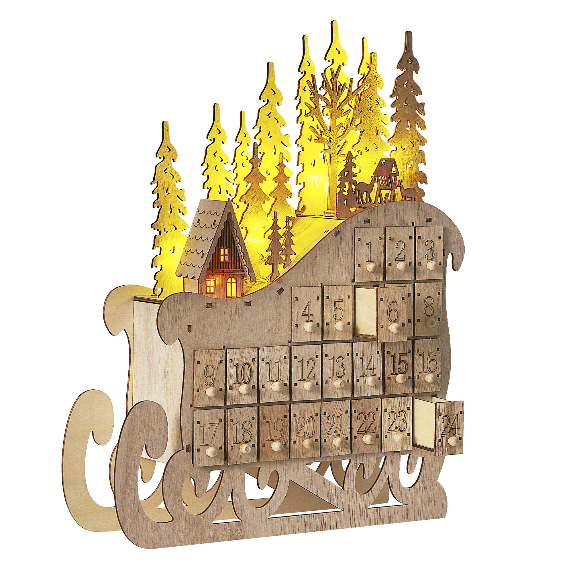 Kaunis puinen joulukalenteri. Yksinkertainen ja kaunis joulukalenteri, joka sopii niin perinteiseen kuin moderniinkin kotiin. Kalenteri on varustettu LED-valoilla, joten se näyttää upean tunnelmalliselta pimeinä talvi-iltoina. Tuo joulun taikaa kotiisi tällä taianomaisella kalenterilla.