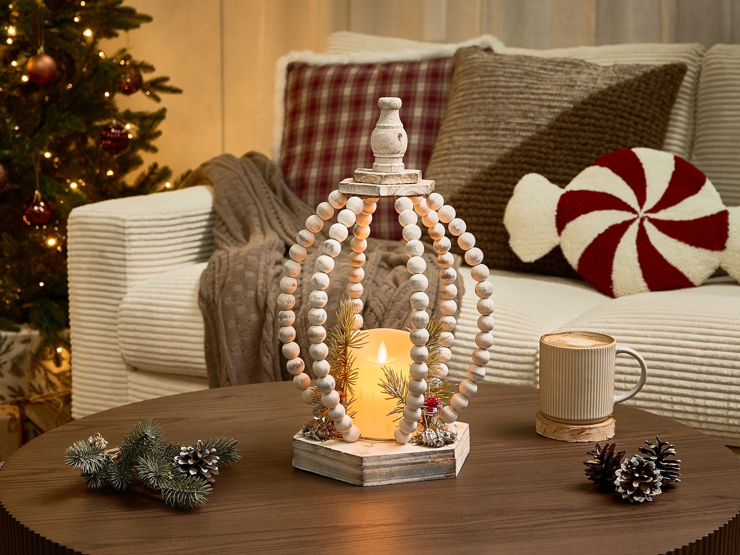 Käsintehty jouluinen lyhty LED-kynttilällä. Tuo joulukoristeluun juhlavaa hehkua tällä ainutlaatuisella joulukoristeella. Käsin jalokuusesta valmistettu koriste muistuttaa muodoltaan lyhtyä, ja sitä koristavat kauniit keinotekoiset marjat, männynoksat ja kävyt. Sen keskellä on realistinen LED-kynttilä, jonka lämmin loiste tuo kodikasta viehätystä konsolipöydälle tai pöydälle.