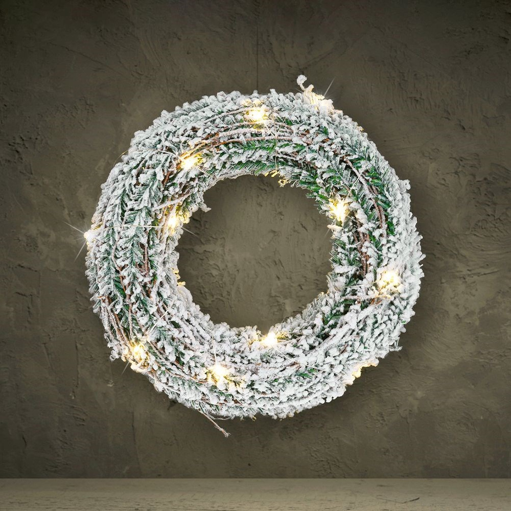 Hohtava joulukranssi LED-valoilla. Sisäkäyttöön. Kranssi näyttää erittäin vaikuttavalta ja on ainutlaatuinen koriste-elementti jouluun. Se näyttää upealta roikkuen ovessa, peilissä, ikkunassa tai seinällä. Sen voi myös sijoittaa lipaston, pöydän tai kaapin päälle. Se lisää ainutlaatuisen ilmeen mihin tahansa sisustukseen. Valmistettu eurooppalaisten standardien mukaisesti.