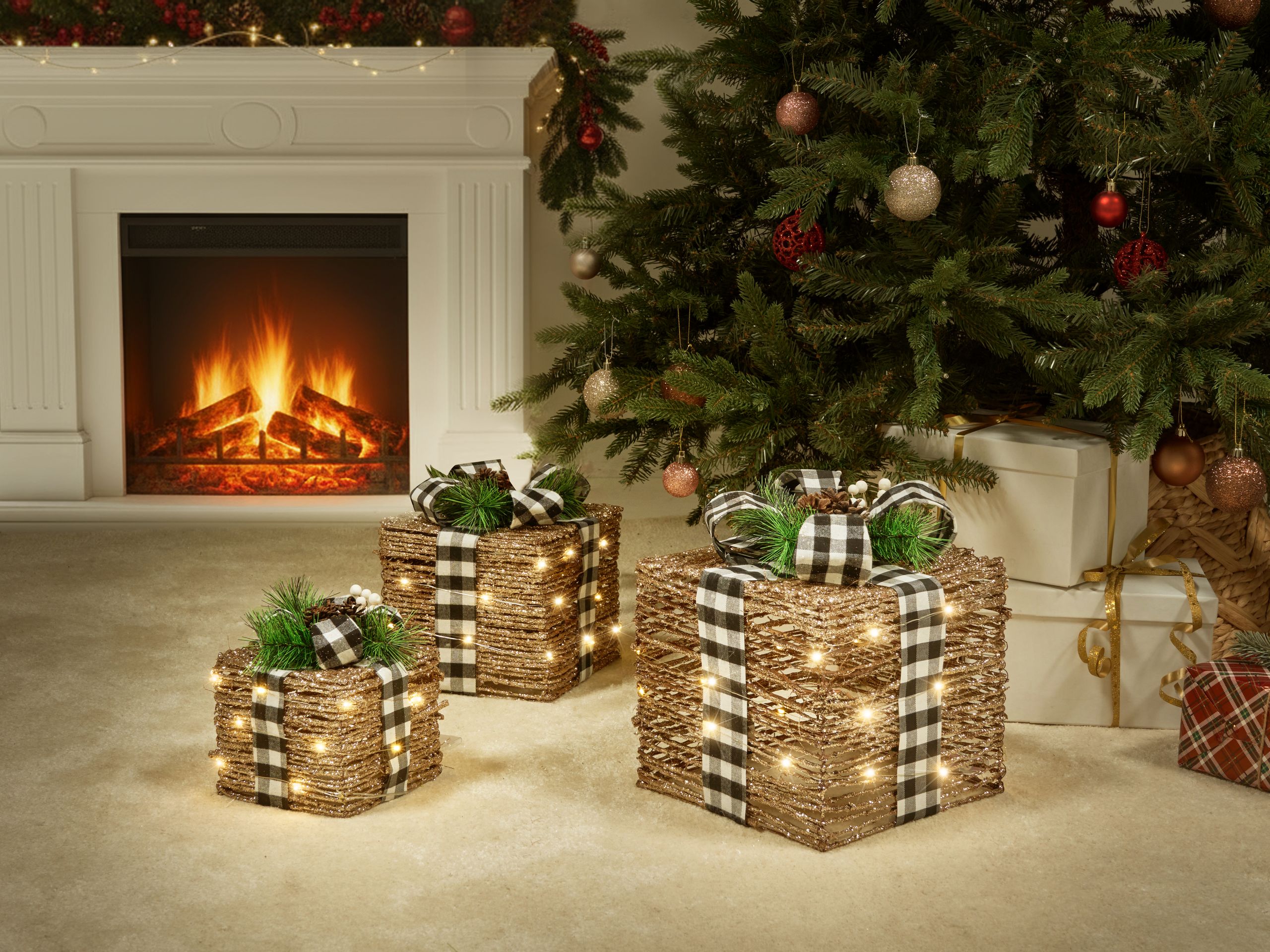 Viehättävät rustiikkiset koristelahjat LED-valoilla. Lisää sisustukseen modernia joulun tunnelmaa tällä kolmen koristelahjan setillä, joka on viimeistelty LED-valoilla ja glitterillä. Jokainen lahjapaketti on koristeltu upeilla mustavalkoisilla lahjanauhoilla, jotka luovat tyylikkään kontrastin lämpimästi hehkuvien valojen kanssa. Ne sopivat täydellisesti koristeiksi takanreunalle tai tyylikkäiksi korosteiksi ympäri kotia, tuoden nykyaikaista eleganssia ja kodikasta sesongin henkeä mihin tahansa tilaan.
