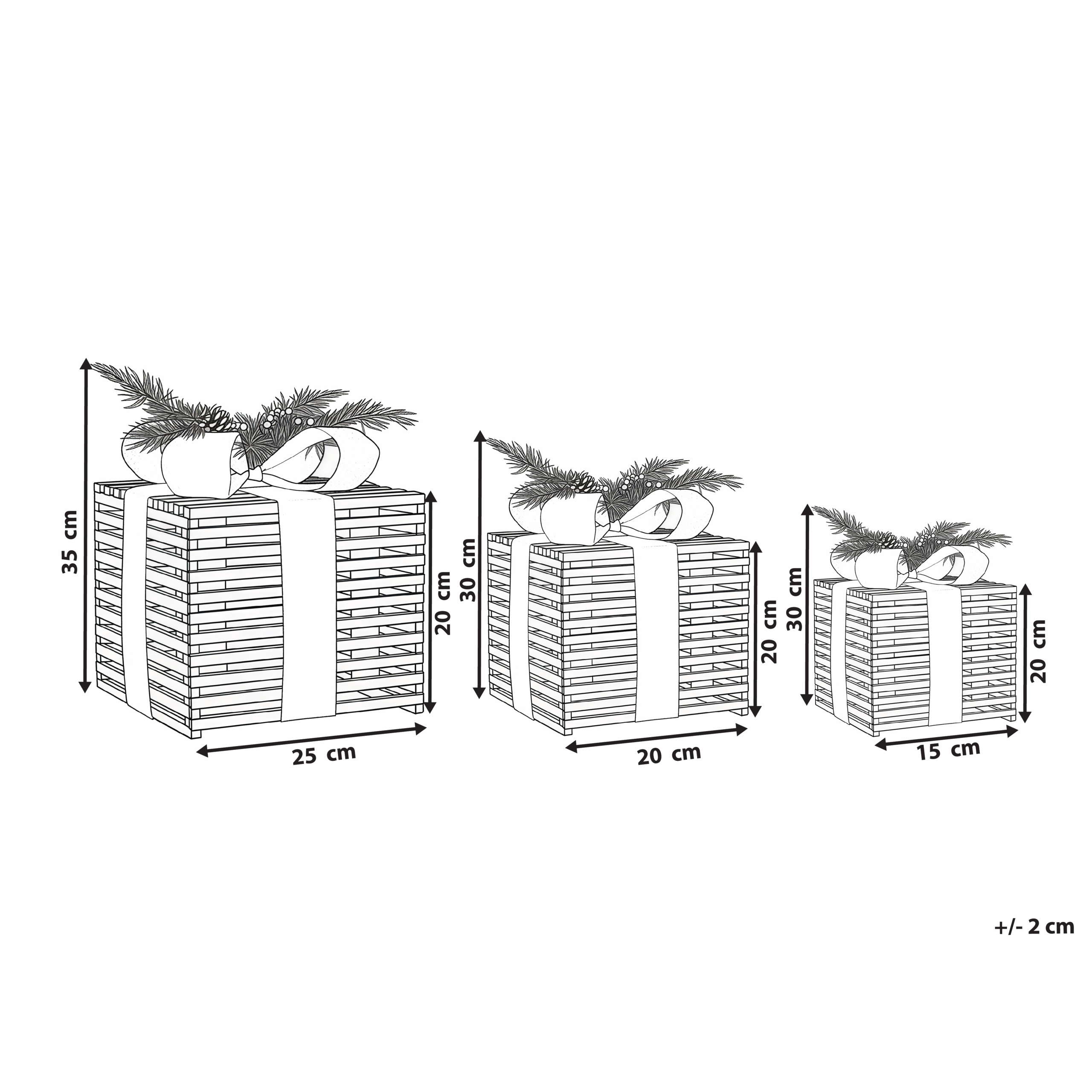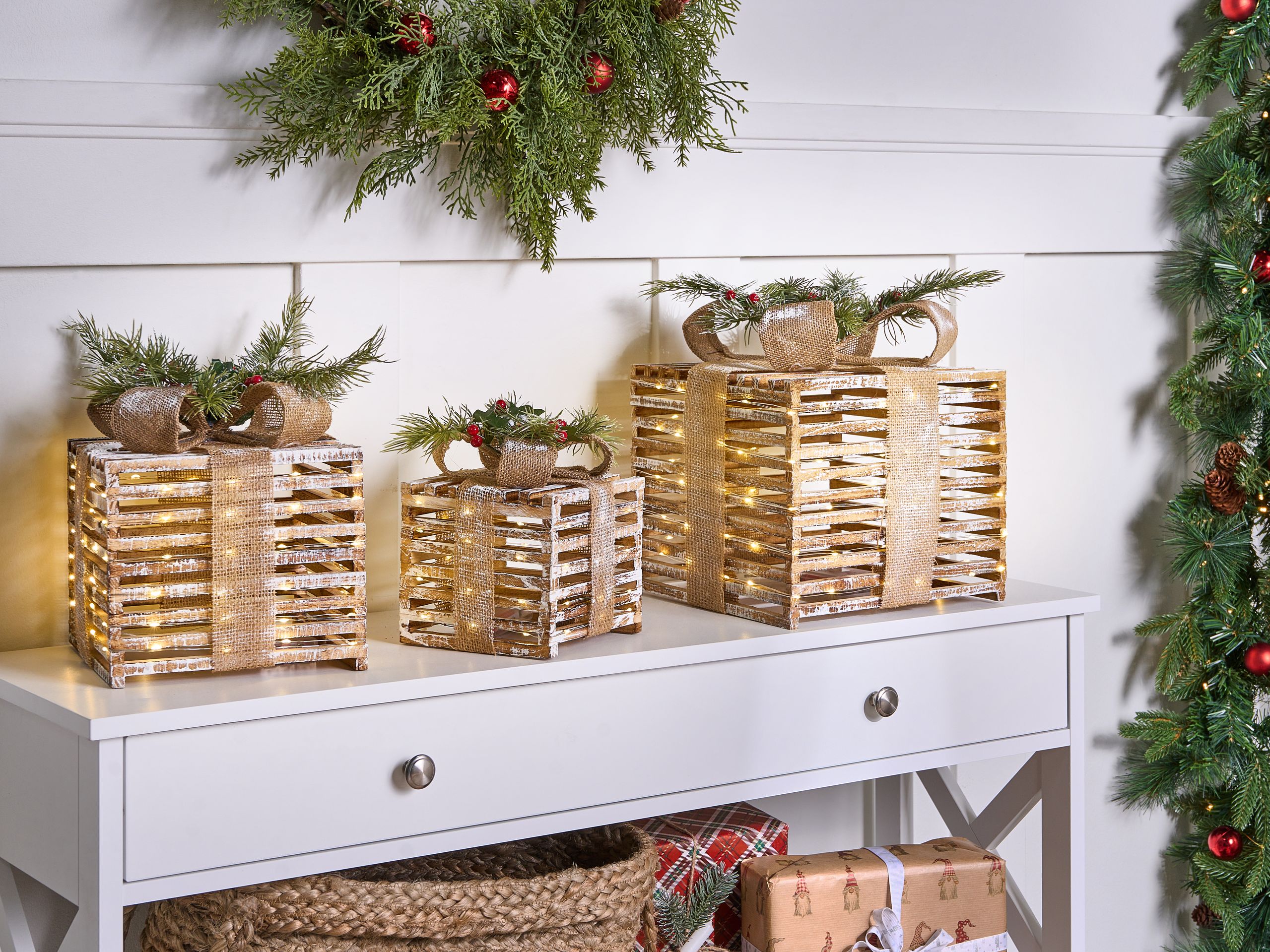 Perinteinen koristelahjasetti LED-valoilla. Lisää sisustukseen joulutunnelmaa tällä kolmen käsintehdyn koristeen setillä, jotka on muotoiltu muistuttamaan joululahjoja. Koristeet on koristeltu eleganteilla ruseteilla, vihreillä tekomännynoksilla, punaisilla tekomarjoilla ja lempeästi hohtavilla LED-valoilla. Ne on valmistettu laadukkaasta jalokuusesta, joten ne ovat kestäviä ja tuovat ripauksen luonnonlämpöä mihin tahansa tilaan. Ne sopivat täydellisesti lipastolle, hyllylle tai pöydälle näyttäviksi keskipisteiksi.
