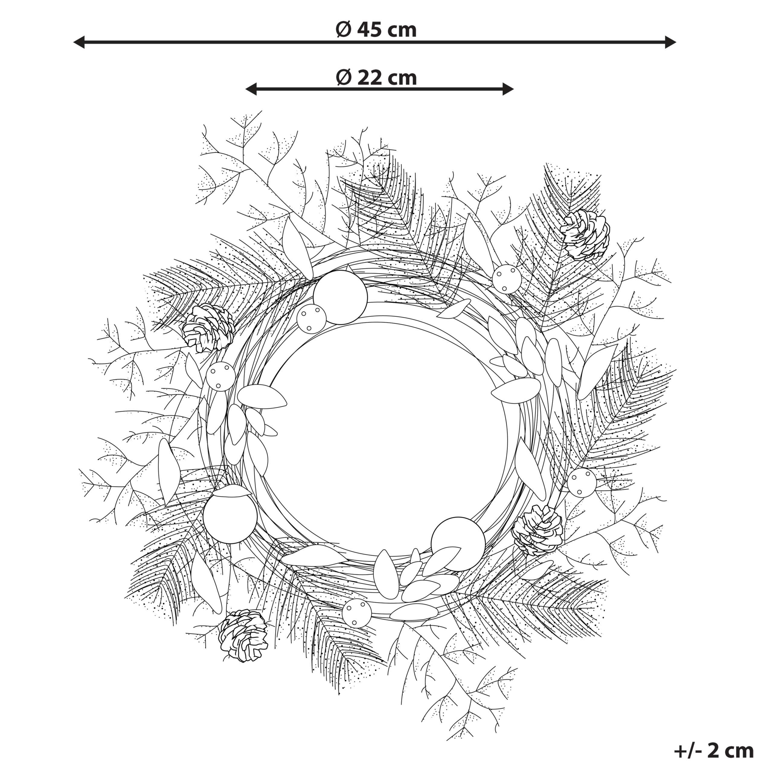Koristeellinen pyöreä joulukranssi. Tuo modernia tunnelmaa joulusisustukseen tällä koristeellisella kranssilla. Koristekranssi on valmistettu käsin keinotekoisista oksista ja kasveista, jotka on viimeistelty kullalla ja ripauksella tekolunta. Hopeiset koristepallot ja kullatut kävyt antavat kranssille glamour-tunnelmaa. Ripusta joulukranssi oveen tai seinälle. Se sopii loistavasti myös joulupöydän koristeeksi yhdessä kynttilöiden kanssa.