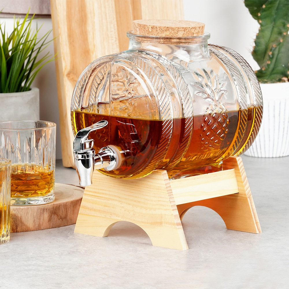 Juomapurkki hanalla - Juoma-annostelija hanalla, 3 litraa, mukana teline. Täydellinen limonadin tarjoiluun kuumina päivinä, boolia tai mehua juhlissa sekä viskiä varten. Purkissa on tyylikäs tynnyrinmuoto, mitat 25 x 14 x 19,5 cm. Telineeseen asetettuna purkin mitat ovat 25 x 17 x 25 cm.