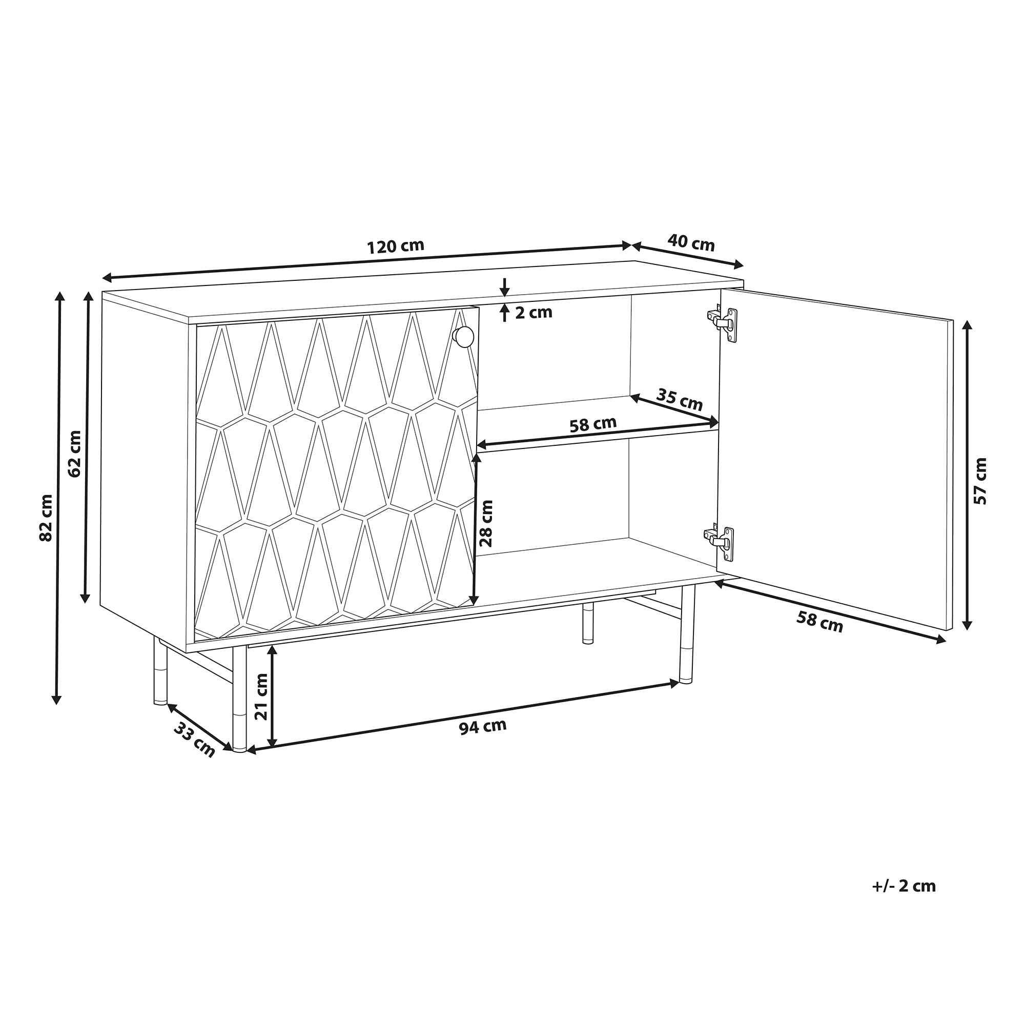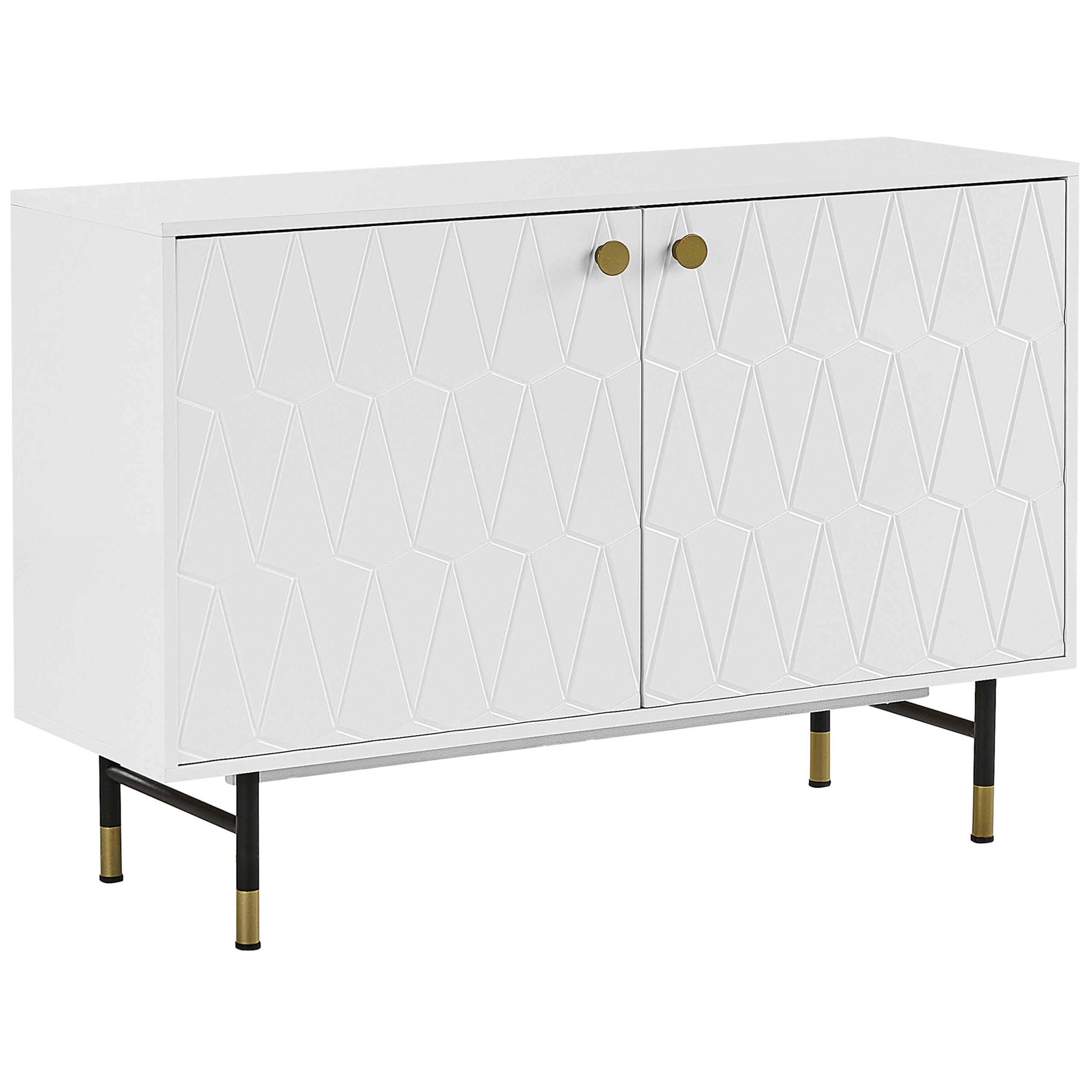 Moderni senkki kullanvärisillä korosteilla. Tämä käytännöllinen senkki on täydellinen lisä olohuoneeseen, eteiseen tai makuuhuoneeseen. Korkealaatuisesta MDF-levystä valmistettua runkoa tukevat metalliset jalat, jotka on viimeistelty kullanvärisillä yksityiskohdilla. Valkoinen väri ja minimalistinen muotoilu yhdessä geometrisen kuvioinnin sekä ainutlaatuisten vetimien kanssa antavat senkille ylellisen ilmeen. Kahden oven taakse kätkeytyvät hyllyt tarjoavat paljon tilaa erilaisille tavaroille tai tekstiileille.