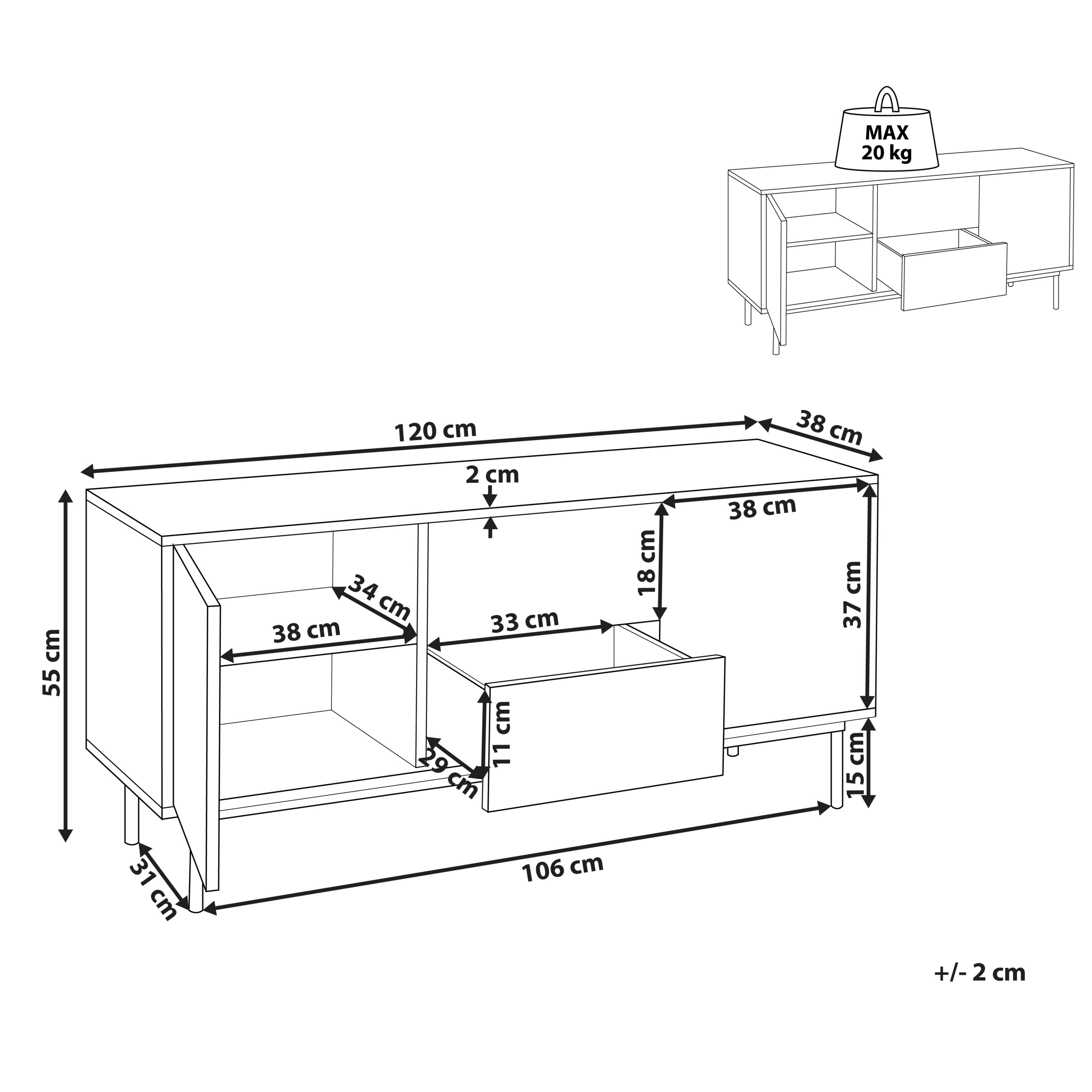 Ominaisuudet: Käytännölliset laatikot tukevalla mekanismilla, Kätevä painamalla avautuva mekanismi helpottaa avaamista, Moderni muotoilu, Puumainen viimeistely luonnollisen ilmeen luomiseksi, Parhaan hoidon varmistamiseksi: suojaa lämpöä ja kosteutta vastaan lasinalusilla ja pöytätableteilla, Jaloissa luistamattomat tapit, Runsaasti säilytystilaa