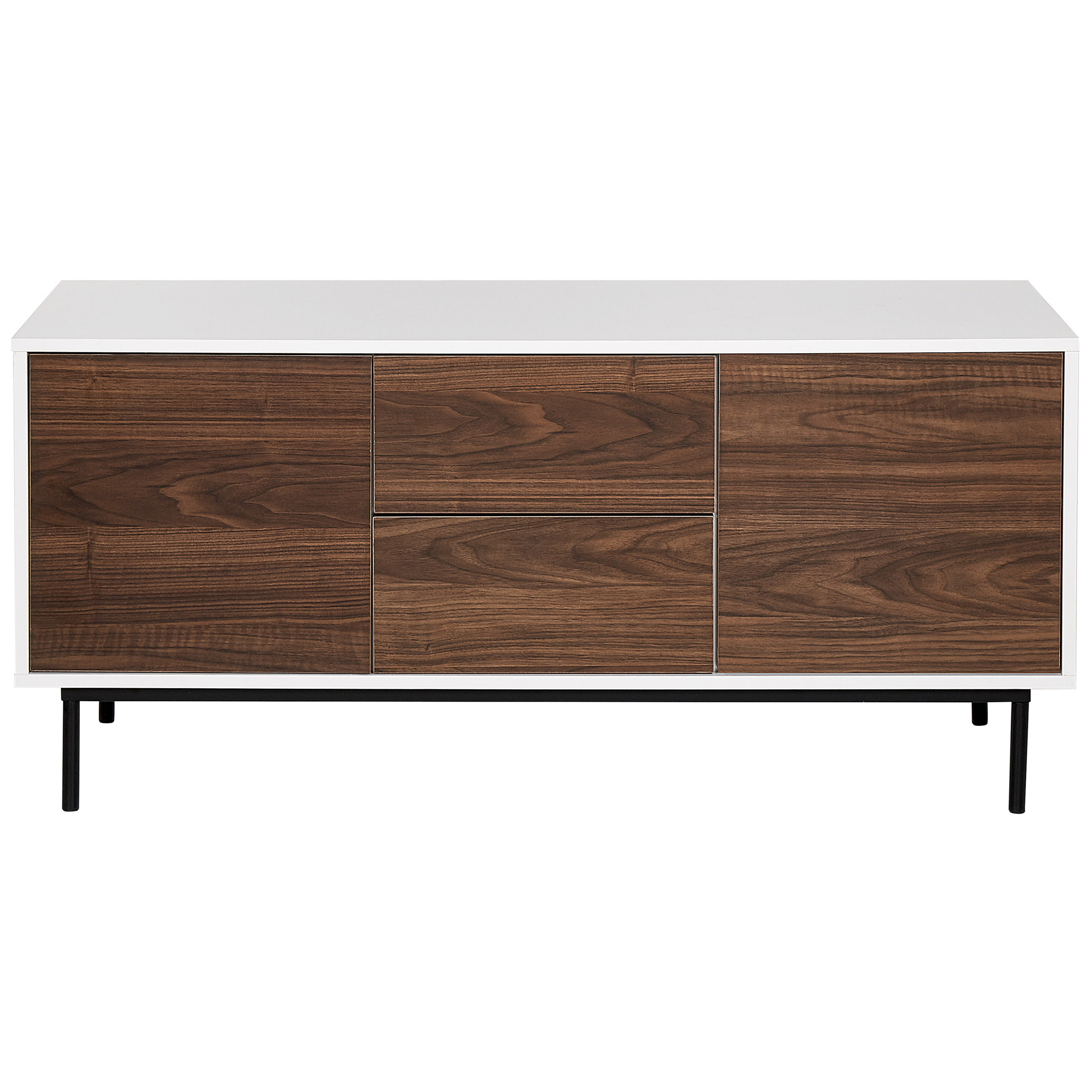 Moderni lipasto laatikoilla ja hyllyillä. Uudista sisustuksesi ilmettä tällä käytännöllisellä senkillä. Korkealaatuisesta lastulevystä valmistetussa senkissä on metalliset jalat, jotka takaavat vakauden. Materiaaliensa ansiosta senkki on kestävä sekä helppohoitoinen. Tumman puun ja valkoisen yhdistelmä saa senkin sopimaan täydellisesti moderneihin tai perinteisiin sisustuksiin. Kaksi hyllyillä varustettua kaappia sekä laatikot tarjoavat paljon tilaa erilaisille esineille, auttaen sinua pitämään tilasi järjestyksessä.