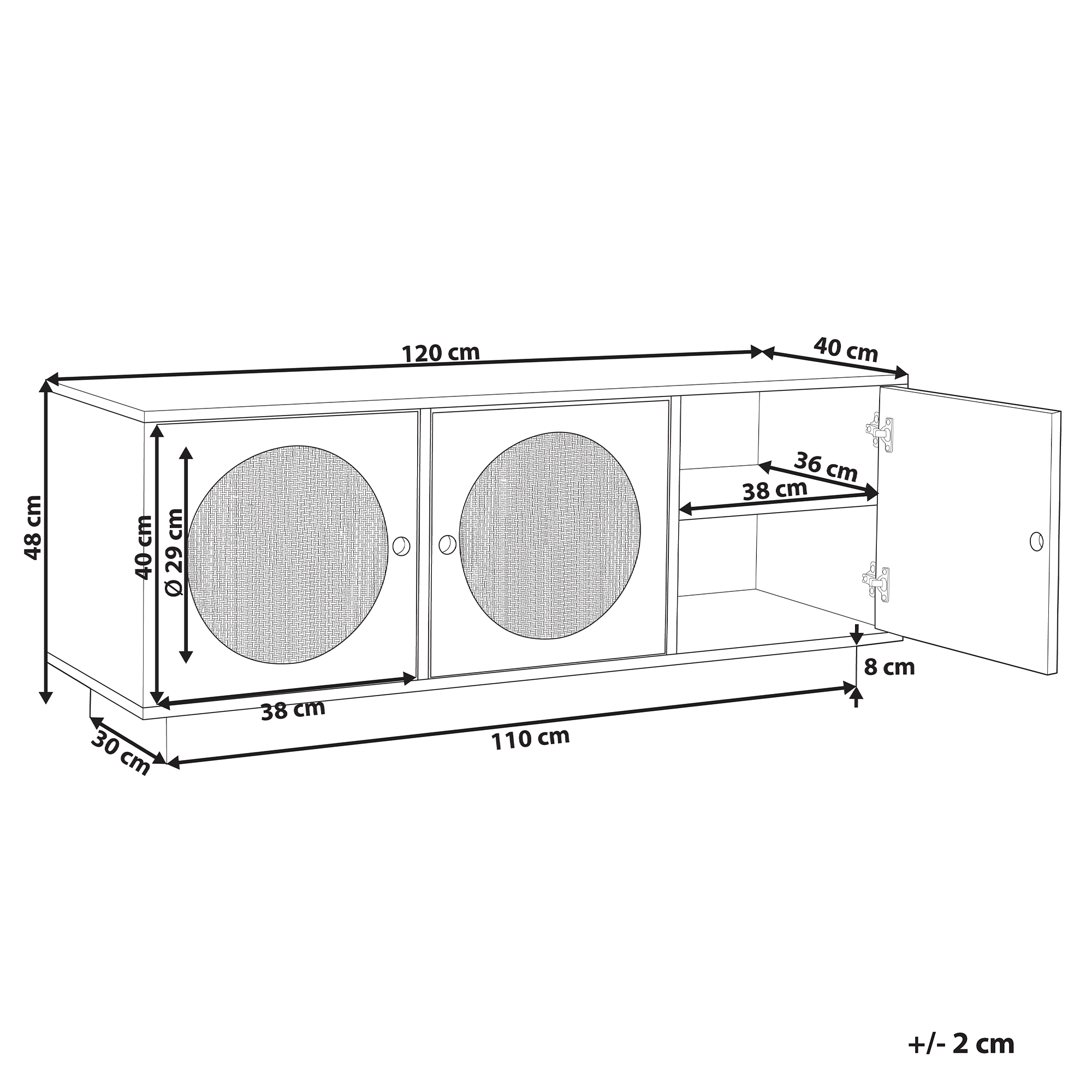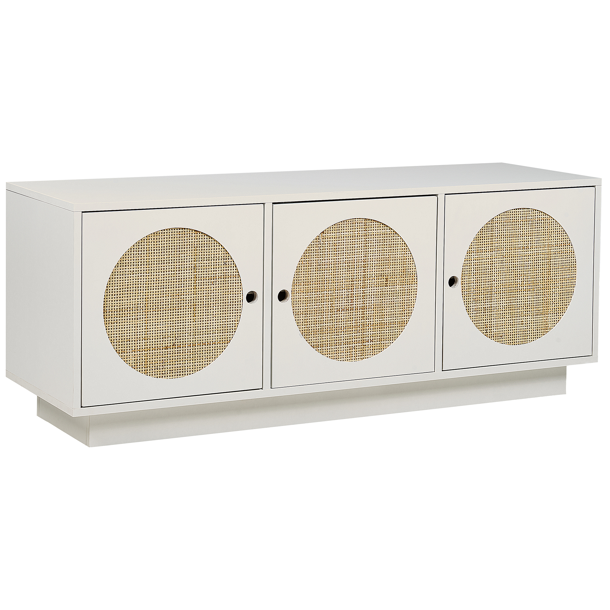Boheemi sivupöytä rottinkiverkko-ovilla. Tämä valkoinen senkki on täydellinen lisäys retrotyyliseen tai eklektiseen olohuoneeseen. Senkin kaunis rottinkipunos on silmiinpistävä ja antaa sille vintage-ilmeen. Kolme tilavaa hyllyä tekevät siitä täydellisen säilytyspaikan kaikenlaisille kodin tavaroille. Sen kahvojen reiät tarjoavat yksinkertaisen, kätevän sekä modernin kosketuksen tuotteen ilmeeseen.