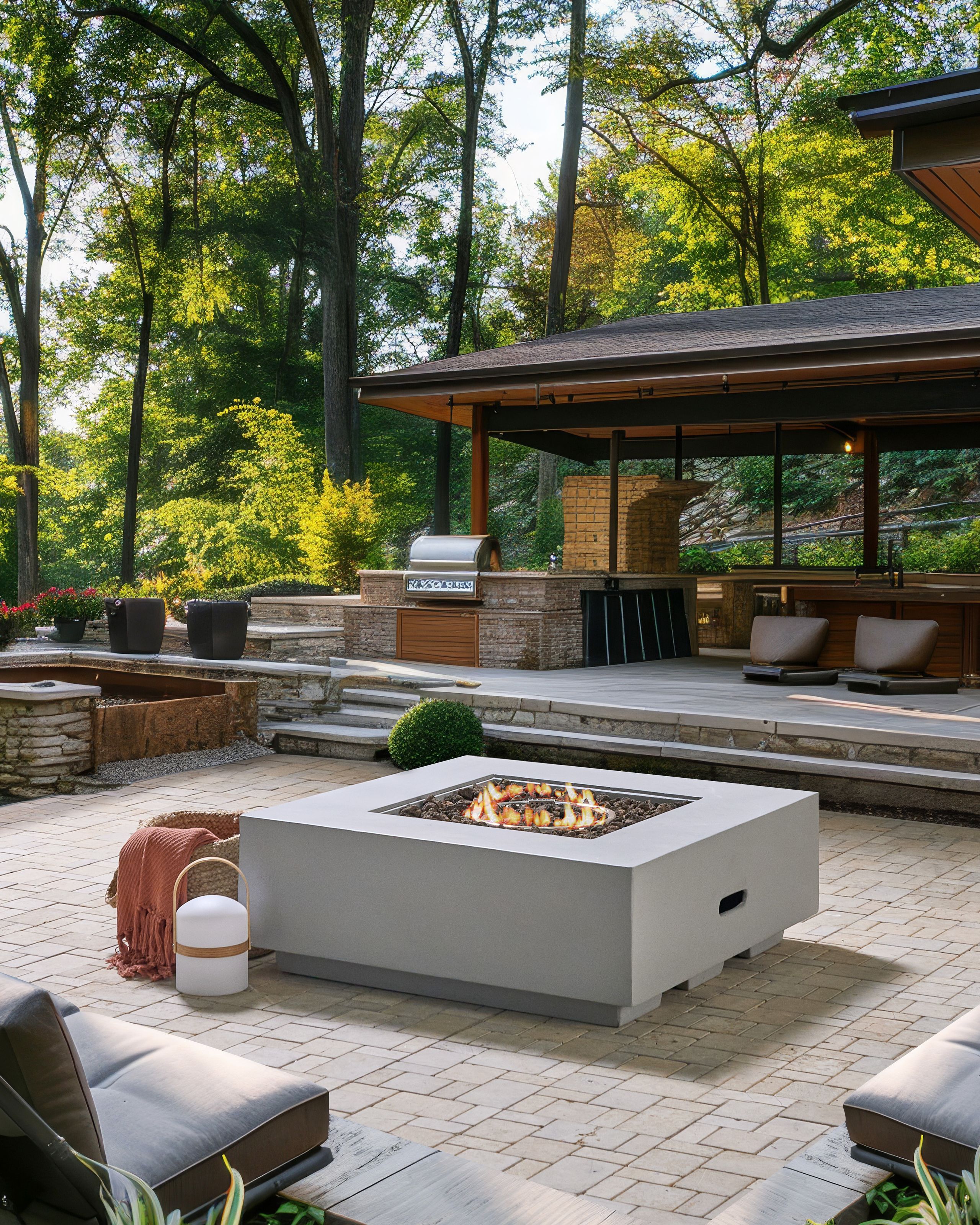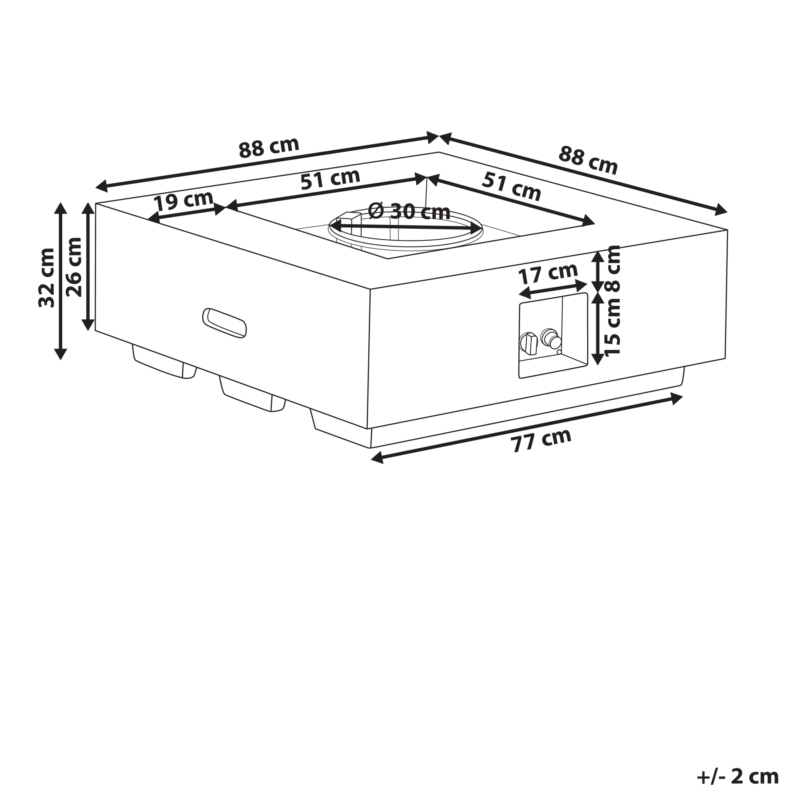 Nelikulmainen kaasukäyttöinen ulkotulisija. Tämä lasikuitubetonista ja ruostumattomasta teräksestä valmistettu tulisija tuottaa puhdasta, savutonta lämpöä, joten se sopii täydellisesti ulkoilmasta nauttimiseen myös viileinä päivinä. Propaanikaasulla toimiva tulisija syttyy vaivattomasti napin painalluksella, ja liekin korkeus on säädettävissä, joten se tarjoaa tasaista lämpöä ilman polttopuiden vaivaa. Laavakivet parantavat lämmön jakautumista ja tuovat samalla liekkiin koristeellisuutta. Kompaktin muotonsa ja kestävän, säänkestävän rakenteensa ansiosta se sopii erinomaisesti terasseille, puutarhoihin tai puutarhakatosten alle – täydellinen oleskelualueiden keskipisteeksi. Piilotettu lokero pitää kaasupullon poissa näkyvistä, ja mukana tulevat kaasuletku ja paineensäädin tekevät asennuksesta nopeaa sekä turvallista.