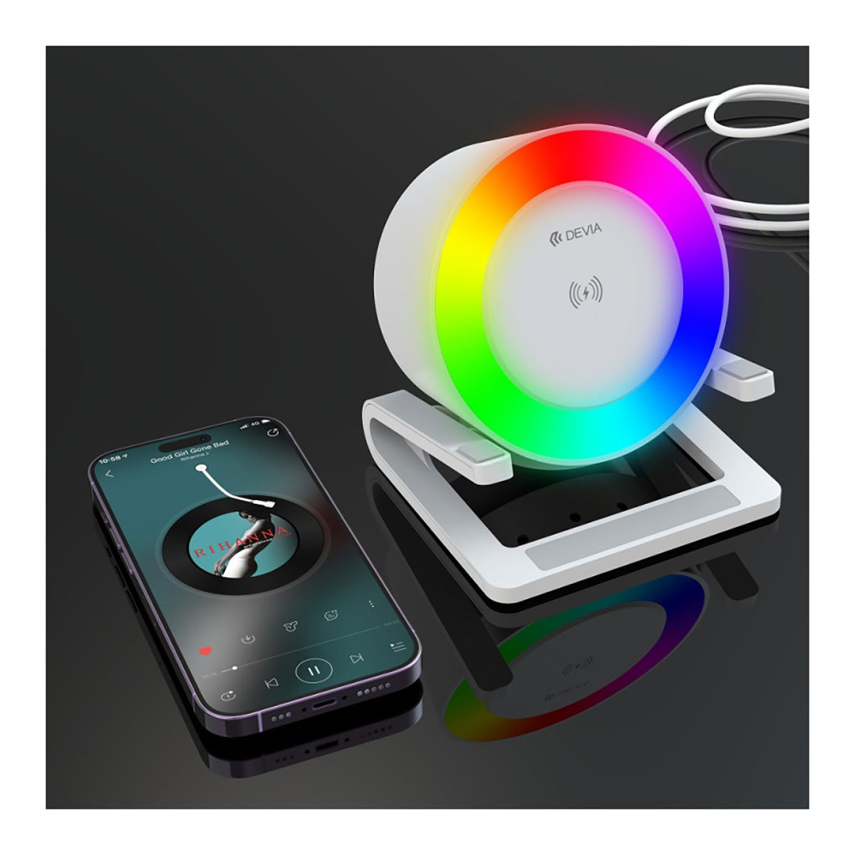 Devia-pöytäkaiuttimessa yhdistyvät 5 W:n Bluetooth-kaiutin, 15 W:n langaton latausasema ja RGB-valaistuksella varustettu yövalo. Se sopii erinomaisesti työpöydälle tai yöpöydälle ja tarjoaa selkeän äänen, nopean latauksen ja mukautettavan valaistuksen.