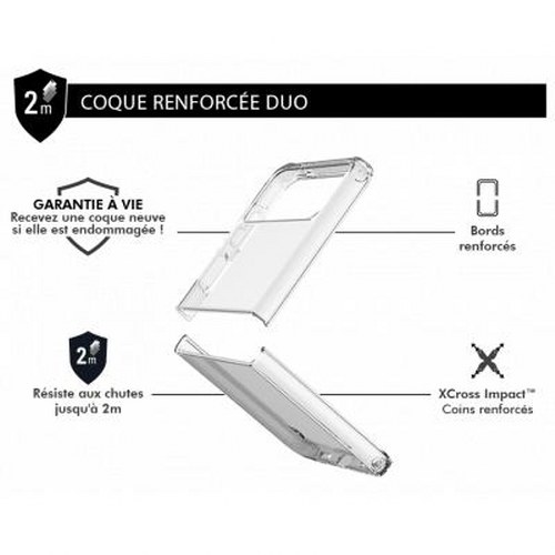 Vahvistettu kuori Samsung Galaxy Z Flip 3 DUO -puhelimelle on erittäin kestävä älypuhelimen suojaava lisävaruste. Siinä on tyylikäs läpinäkyvä viimeistely ja räätälöity vahvistettu muotoilu, joka kestää iskuja ja pudotuksia 2 metristä. Kuori on valmistettu muovista ylimääräisen kestävyyden takaamiseksi.