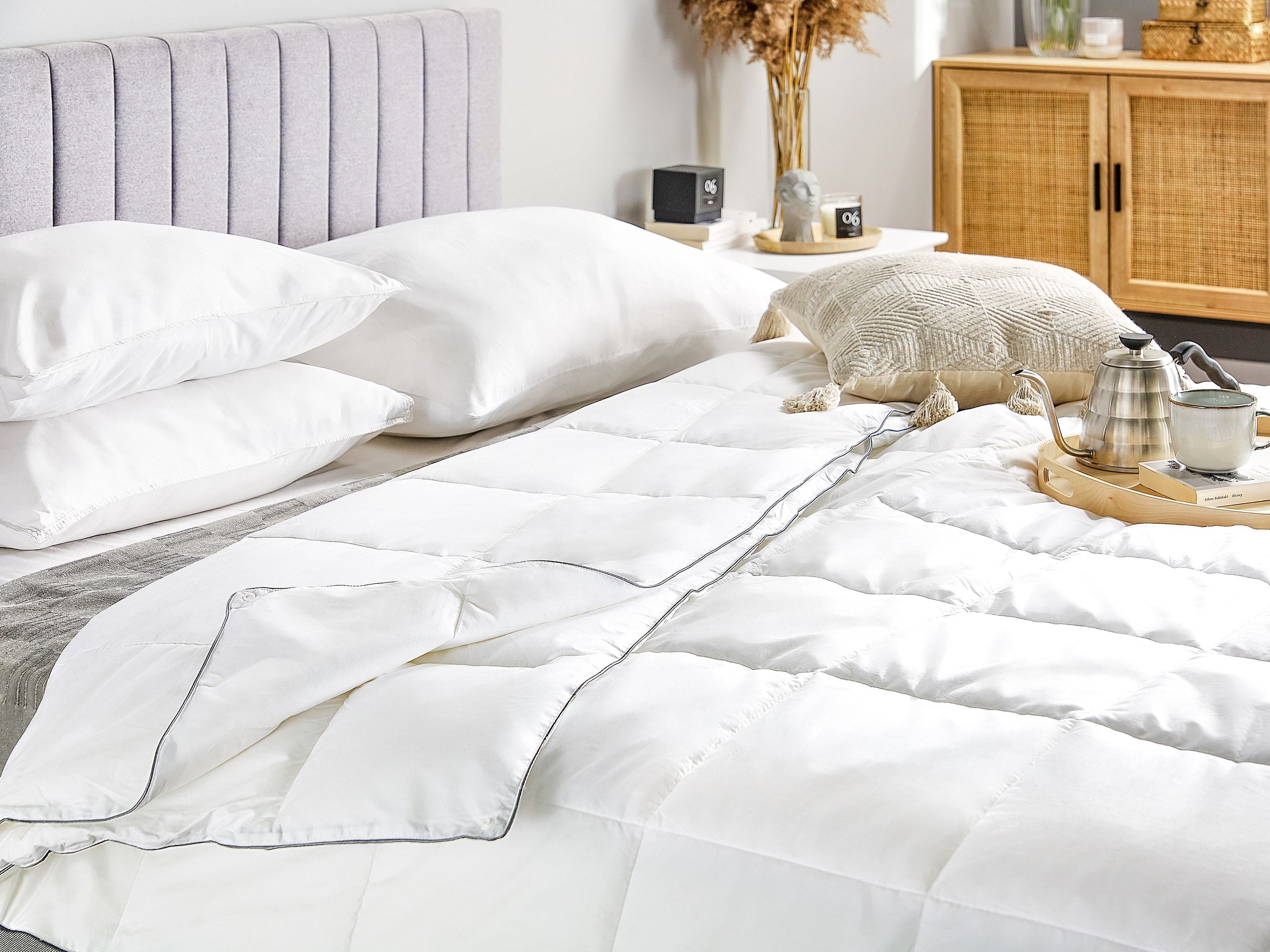 Kaksiosainen täkki ympärivuotiseen käyttöön. Nuku yöt mukavasti ja nauti optimaalisesta lämmöstä ympäri vuoden tällä peitolla. Se koostuu kahdesta eripaksuisesta osasta, jotka voidaan kiinnittää toisiinsa tai käyttää erillään tarpeen mukaan. Peiton päällinen on valmistettu korkealaatuisesta japara-puuvillasta ja siinä on ruututikkaus, joka takaa tasaisen mikrokuitutäytteen jakautumisen. Harmaa satiiniputkitus suojaa reunoja samalla, kun se korostaa peiton ulkonäköä.