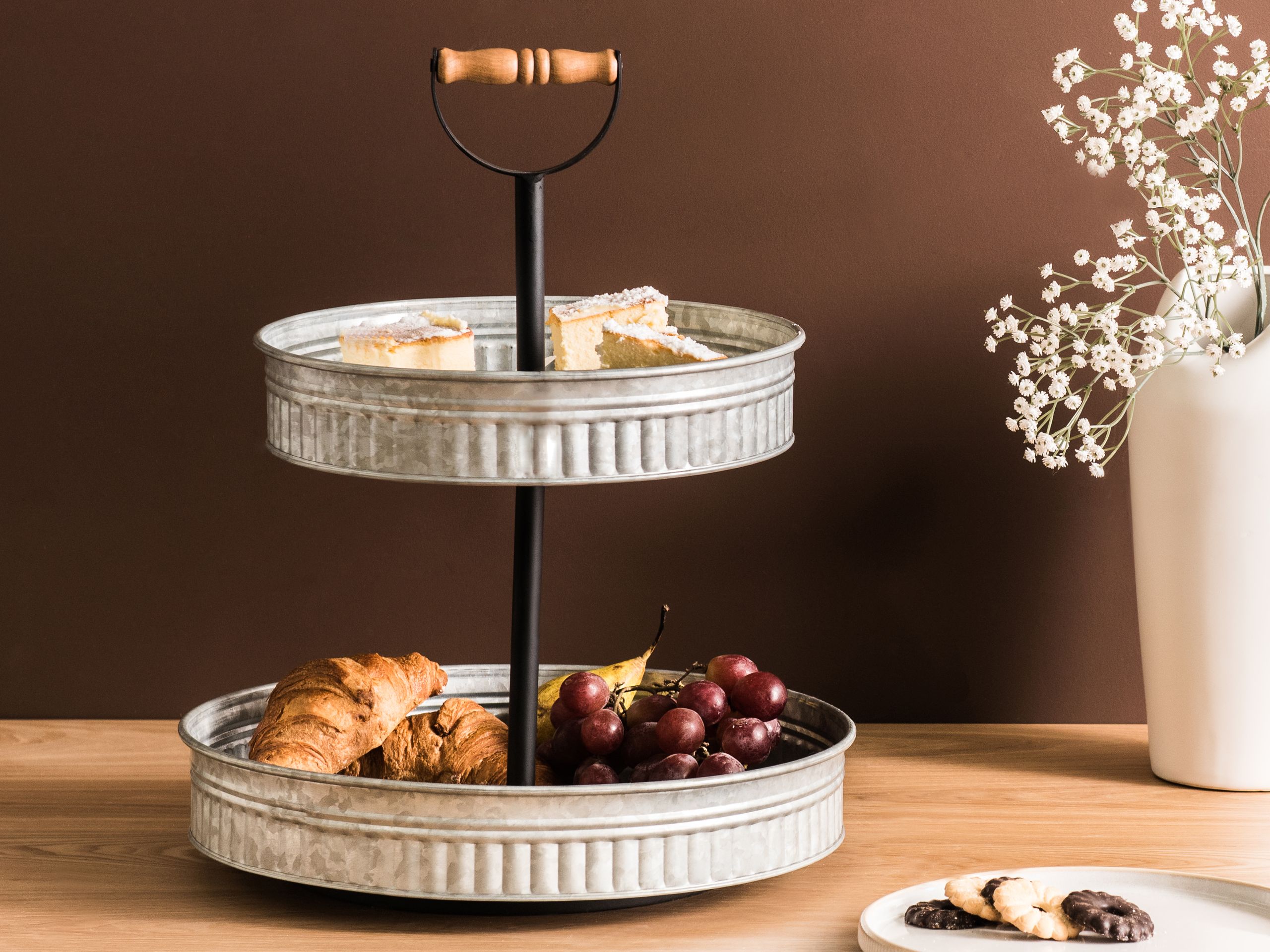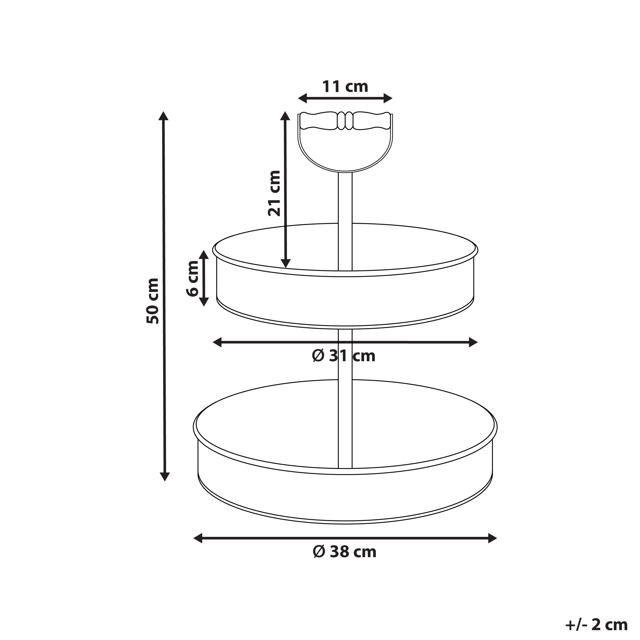 Glamour-tyylinen kaksikerroksinen kakkuvati kahvalla. Lisää kotiisi ripaus glamour-viehätystä tällä kaksikerroksisella kakkuvadilla, joka sopii täydellisesti keittiötarvikkeiden järjestyksessä pitämiseen, herkkujen tarjoiluun tai koriste-esineiden esillepanoon. Tukeva rautarakenne takaa kestävyyden, ja luonnollisesta eukalyptuspuusta valmistettu kahva lisää lämpöä ja vintage-henkistä tunnelmaa. Se on monipuolinen ja tyylikäs lisä mihin tahansa keittiöön, ruokailutilaan tai tapahtumaan.