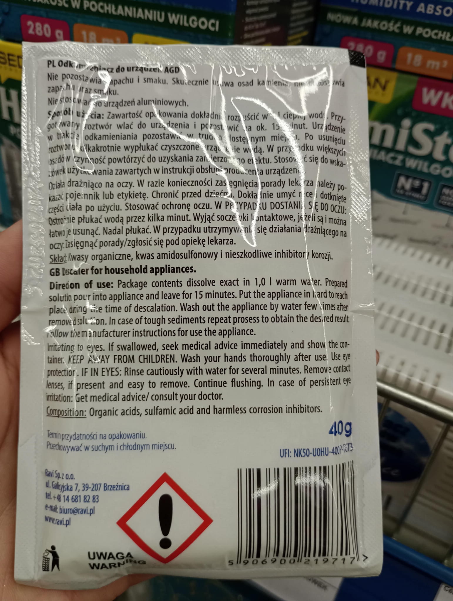 Kalkinpoistoaine on täysin turvallista terveydelle – se sisältää sekoituksen ruokahappoja. Se ei jätä epämiellyttävää makua tai hajua. Pussi sisältää 40 g tuotetta.