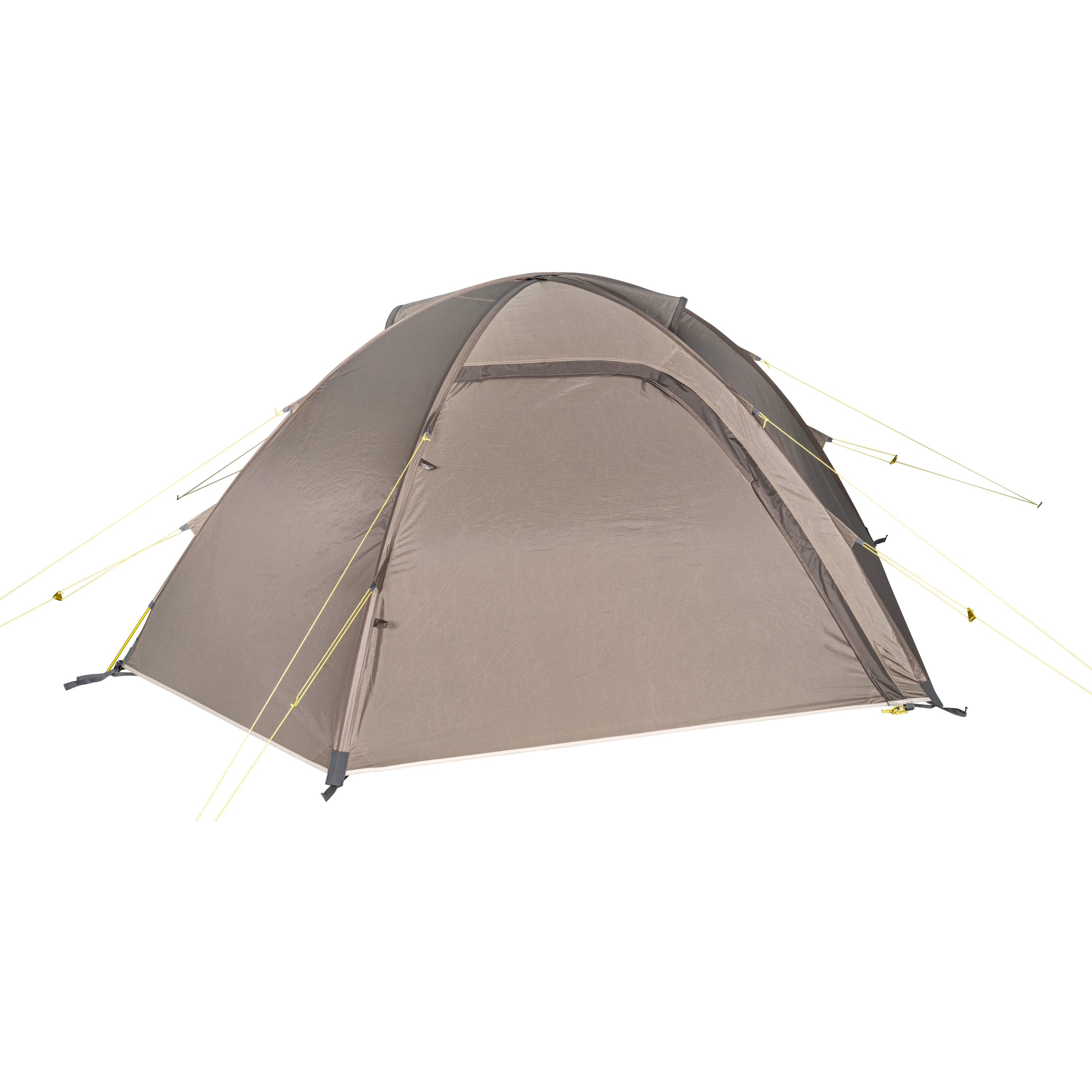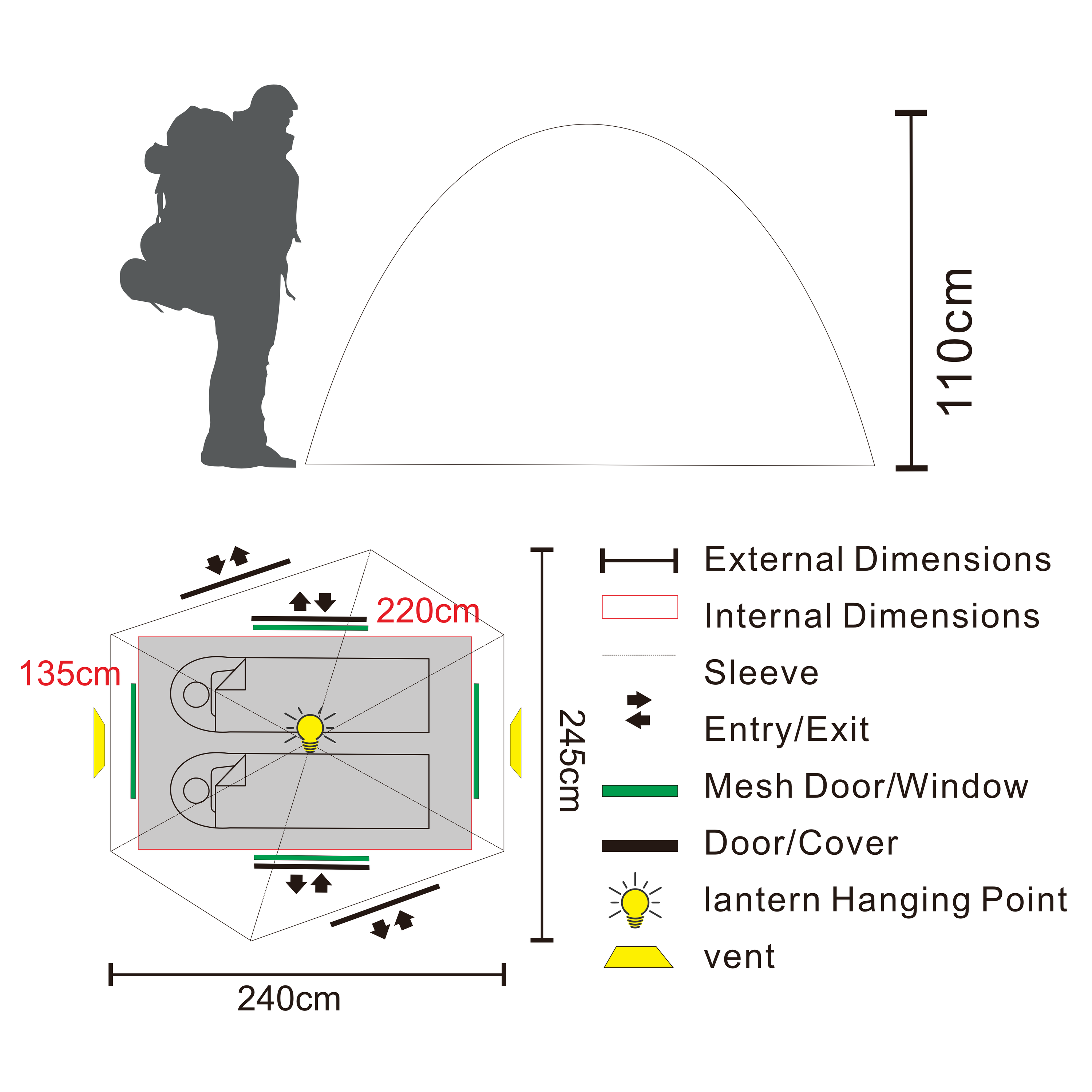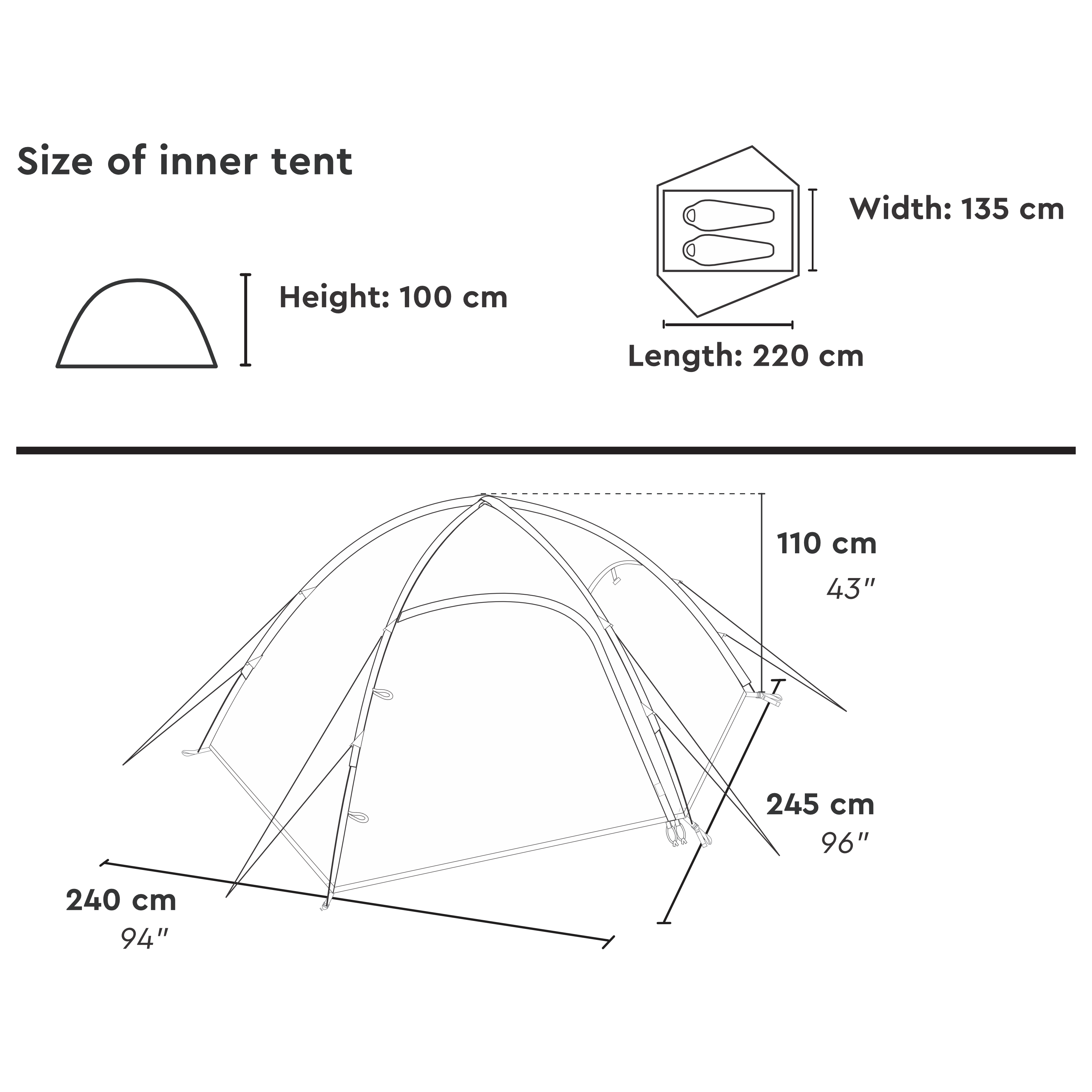 Ulkoteltan mitat ovat noin 240 × 245 × 110 cm (P × L × K) ja tarjoavat tilavan kokonaispinta-alan. Sisäteltta, kooltaan noin 220 × 135 × 100 cm, tarjoaa mukavasti tilaa kahdelle hengelle. 3 000 mm vesipilari ulkoteltassa suojaa luotettavasti sateelta, ja kestävä pohja, jossa on 5 000 mm vesipilari, estää tehokkaasti maankosteuden pääsyn sisään.