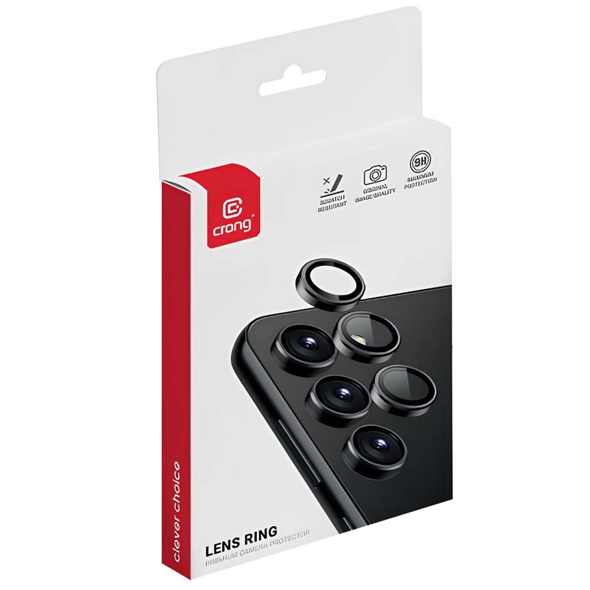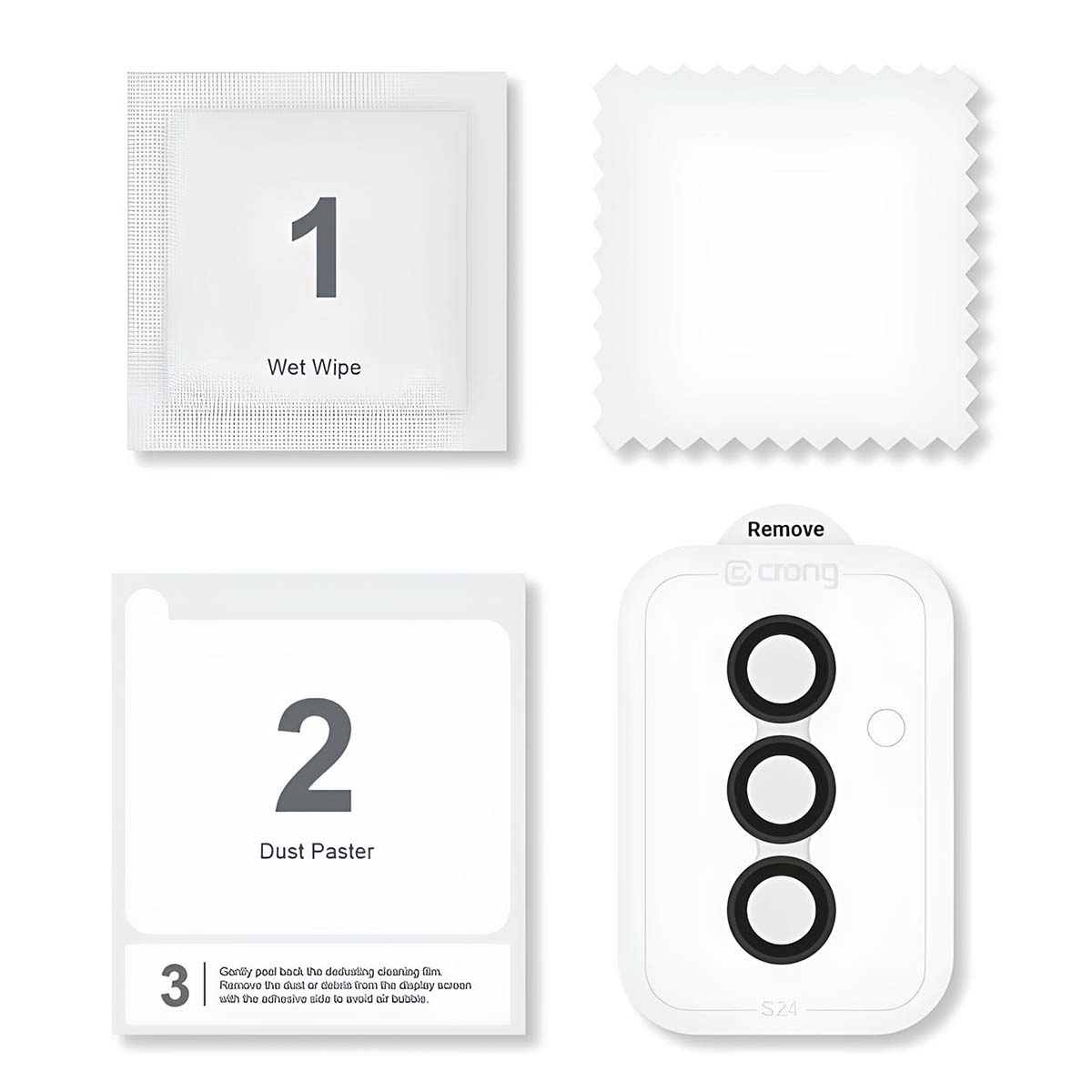 Crong Lens Ring -suoja Samsung Galaxy S24+ -puhelimelle. Se on valmistettu 0,33 mm:n karkaistusta lasista ja alumiinirenkaista ja suojaa linssit tehokkaasti naarmuilta ja kolhuilta. Läpinäkyvä ja ohut, se säilyttää valokuvien ja videoiden laadun. Helppo asentaa mukana toimitetulla sarjalla ja leikata kamerayksikköön sopivaksi.