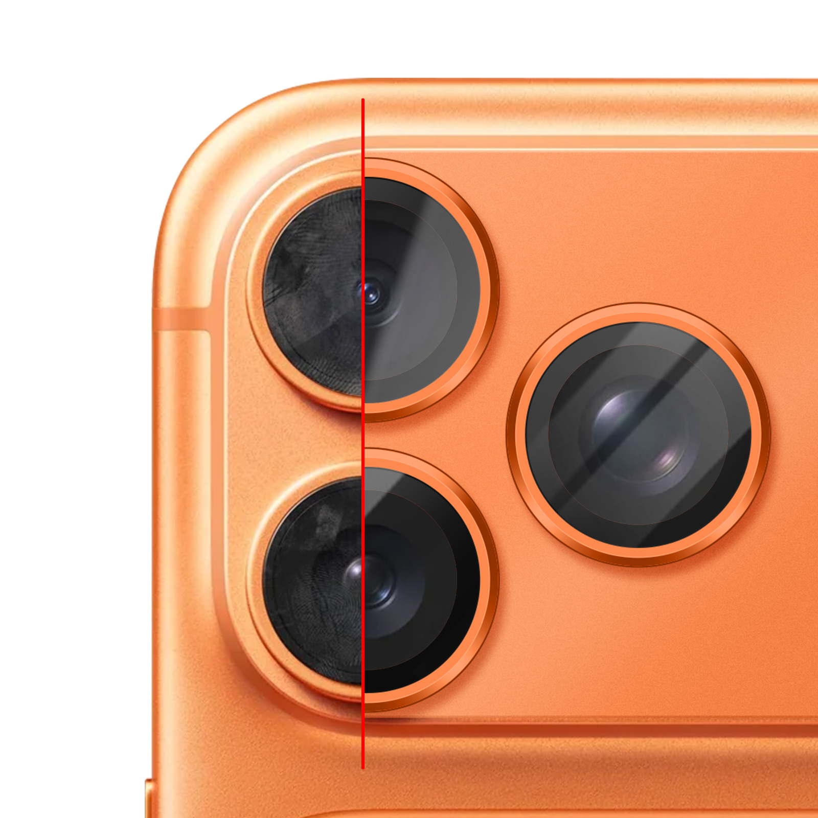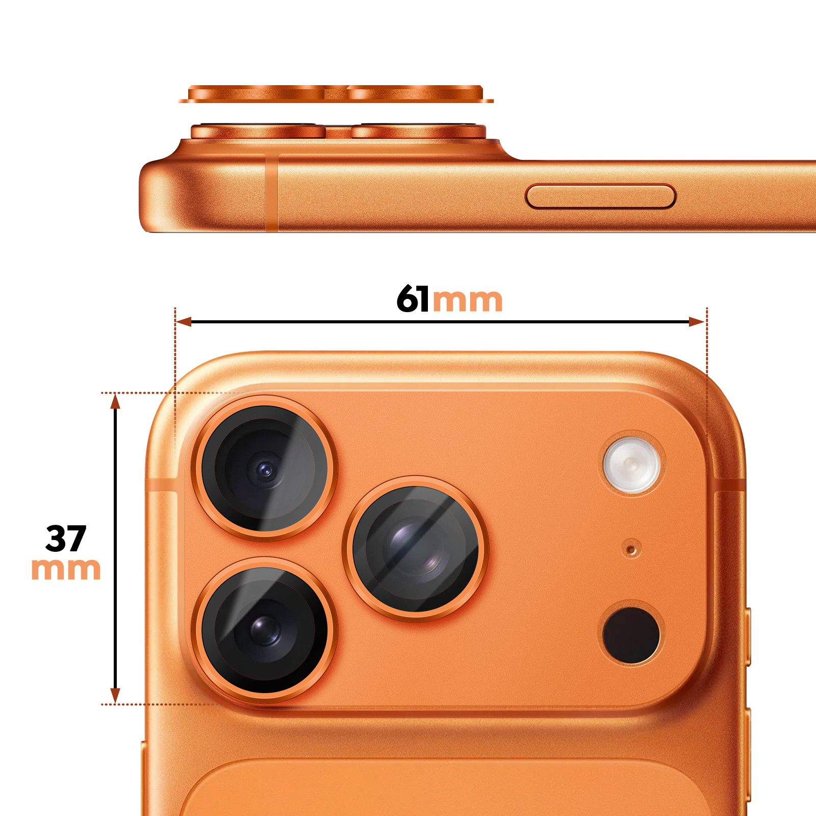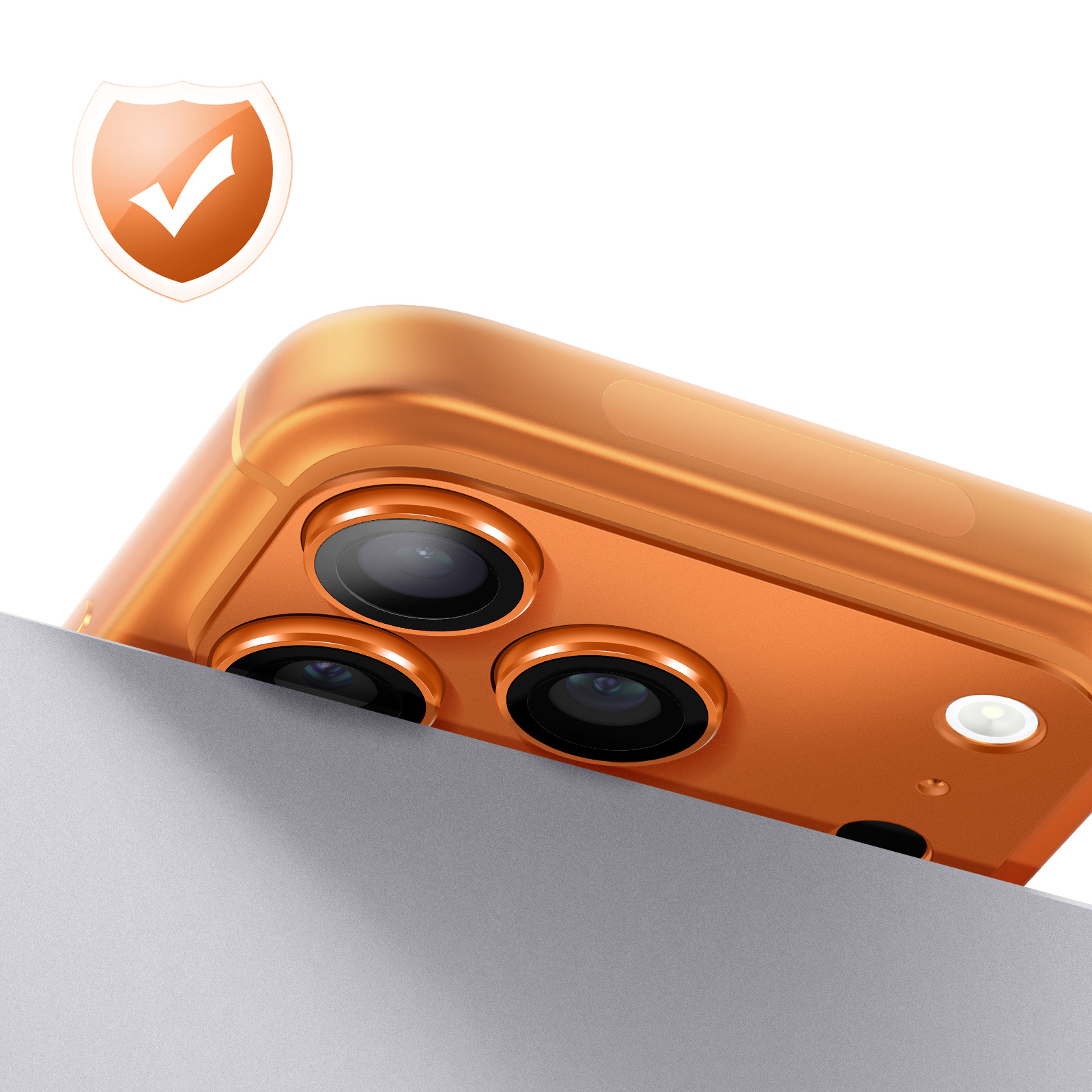 Cosmic Orange -yleiskamerasuoja iPhone 17 Pro -puhelimelle suojaa koko valokuvausyksikön kestävällä alumiinikehyksellä ja naarmunkestävällä karkaistulla lasilla. Se vaimentaa iskuja ja kulumista ja säilyttää samalla valokuvien ja videoiden laadun korkean läpinäkyvyytensä ansiosta. Sen tarkka istuvuus kunnioittaa täydellisesti antureita ja salamaa, ja sen ansiosta voit asettaa iPhonen litteäksi ilman suoraa kosketusta kamerasaareen.
