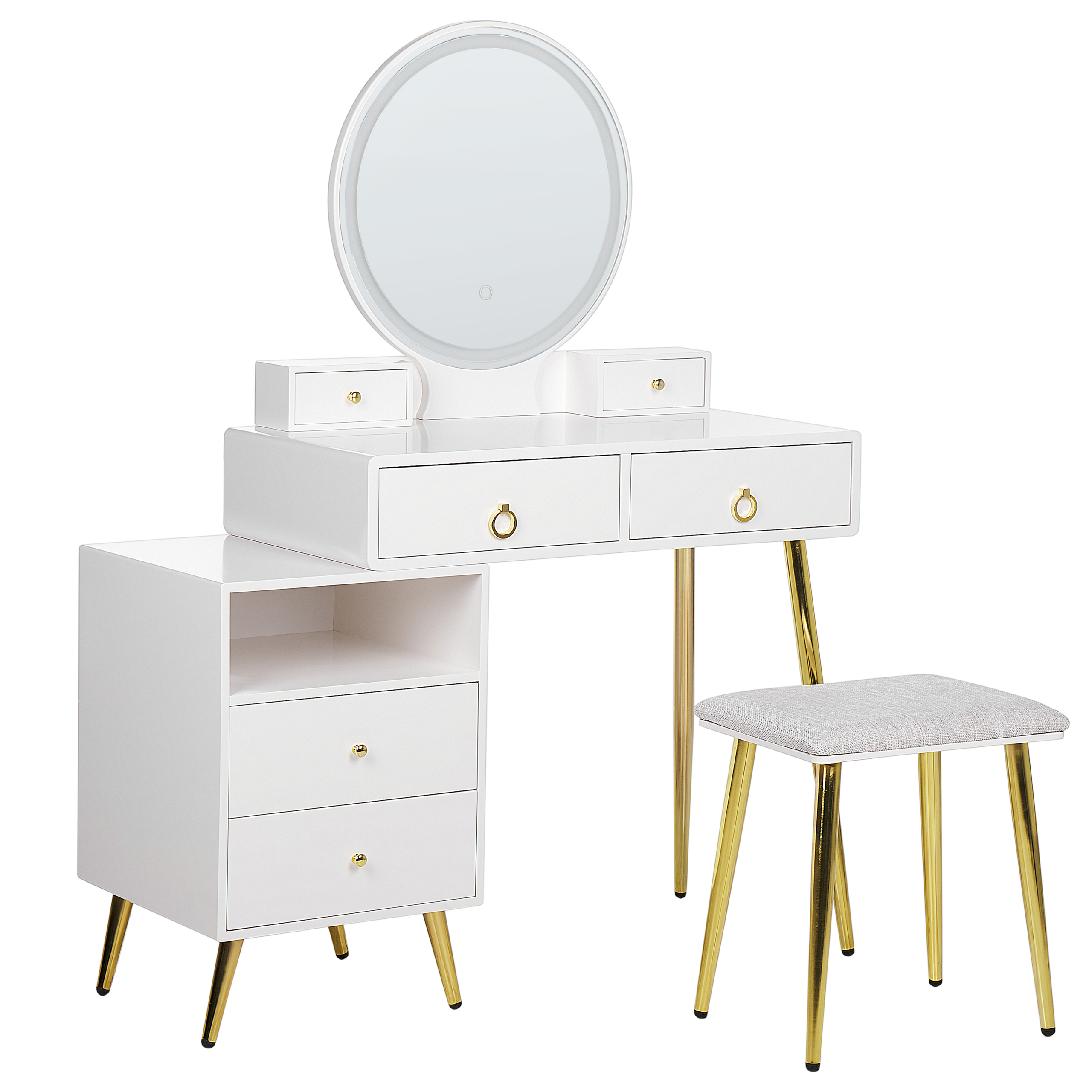 Moderni peilipöytä mukavalla jakkaralla. Tämä tyylikäs kampauspöytä ei ole vain täydellinen paikka meikkaamiseen, vaan siinä on myös leveä pöytälevy opiskelua tai työskentelyä varten. Kuusi tilavaa laatikkoa ja yksi hylly tarjoavat runsaasti säilytystilaa niin kosmetiikalle kuin koruillekin mukana tulevan järjestelijän ansiosta. Käytännöllinen liikuteltava kaappi voidaan asentaa kummalle puolelle tahansa, mikä mahdollistaa sen mukauttamisen tarpeisiisi. Integroitu LED-peili tarjoaa täydellisen valaistuksen, helpottaen rutiinejasi huomattavasti. Lisäksi mukana tuleva tyylikäs kangasverhoiltu jakkara tarjoaa mukavan istumapaikan.